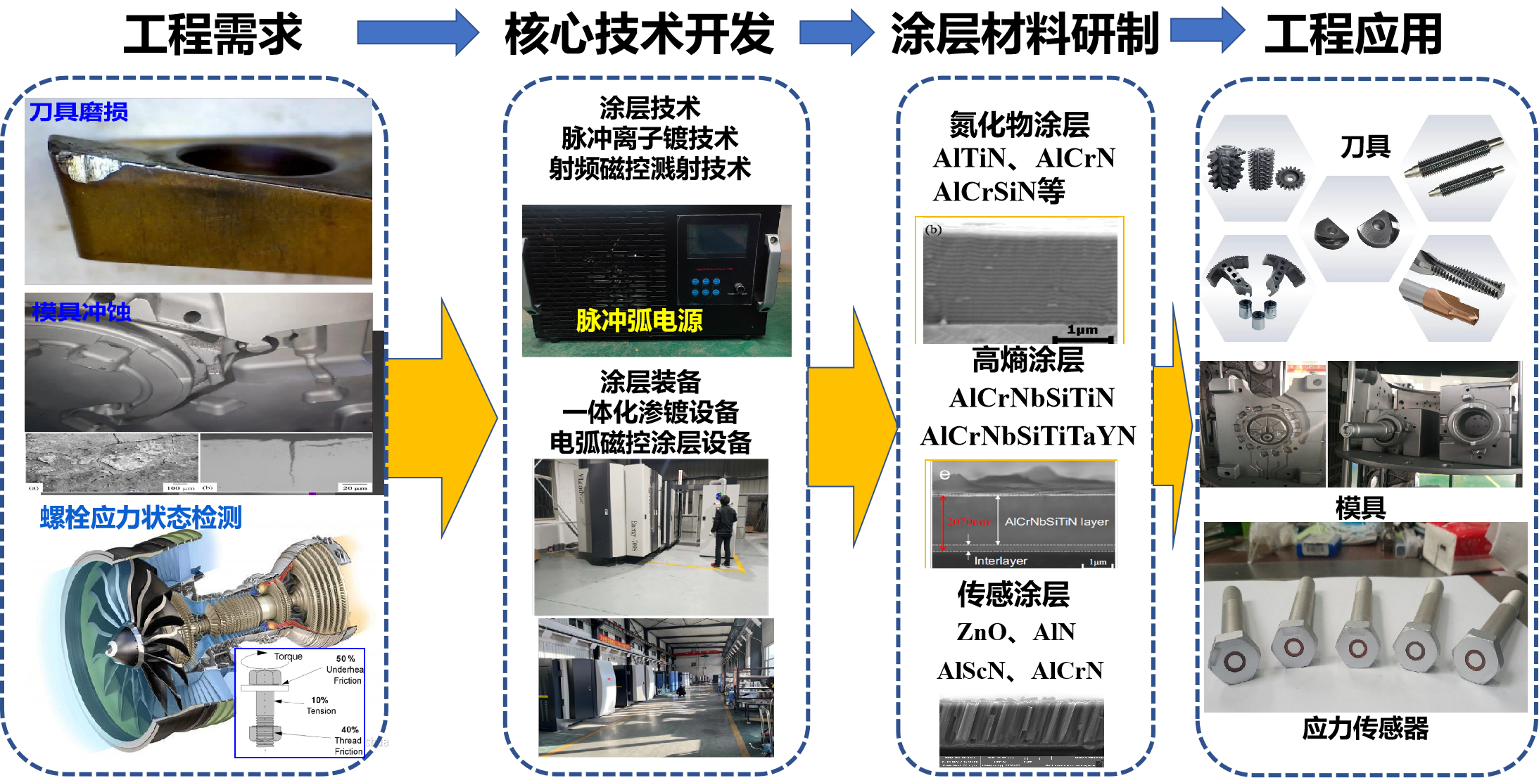 围绕航空航天、能源、船舶等高端装备对表面耐磨防腐蚀及应力温度传感的需要,开发了系列的涂层材料及涂层装备并进行了产业化应用。工模具产品已经成功应用于压铸模具、滚齿刀具、铣刀。应力传感涂层产品已经成功应用于航空发动机、风力发电机等装备中。承担了国家重点研发课题、国家自然科学基金、国际合作、JP配套等等科研项目20余项。