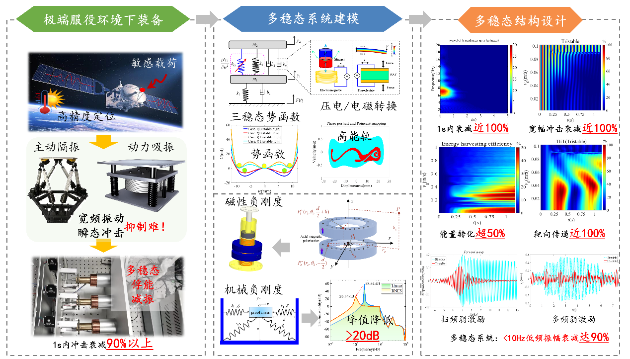 主要从事宽低频非线性振动控制与俘能、空间结构微振动控制、高端装备冲击防护方法、多物理场耦合仿真、齿轮摩擦动力学等方向研究,实现了振动控制与俘能高效协同关键技术突破;聚焦空间挠性航天器多源微振动控制和瞬态冲击问题,提出了基于能量分流的多稳态减振耗能方法,并研制了一套主动可调的多稳态减振与俘能协同样机。