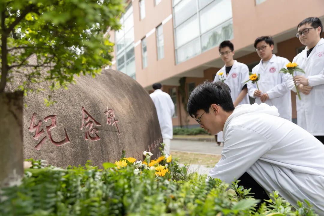 4月22日上午,在学校实验动物纪念碑前,师生们身着白大褂,手持菊花,依次整齐地站立在纪念碑前默哀鞠躬,表达对它们的尊重和敬意。