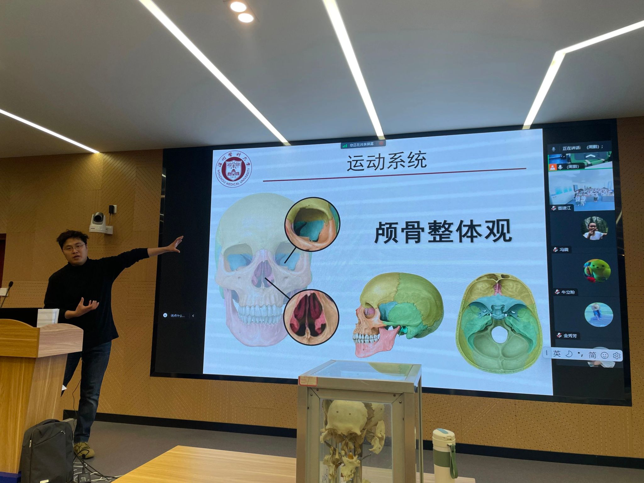活动共分2次,3月2日是第一次活动,由我校解剖学教师李军伟老师授课,基于人类骨学章节主讲《分离颅骨》内容。李老师借助丰富的、多角度的解剖资源,结合临床应用,由总到分、由浅到深逐步剖析人类颅骨的整体结构和局部特征,带领两校学生熟悉、熟识、熟知自我的身体结构。随后,通过线上问答互动,激发学生对于解剖学的浓厚兴趣,为后续的理论学习和动手实操奠定基础。