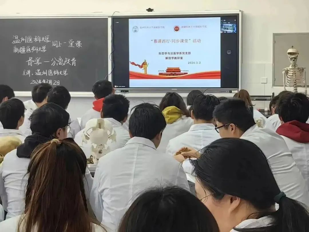 形态学与法医学系党支部人体解剖学教研室与新疆医科大学人体解剖学教研室通过互联网开展远程教学,举办“慕课西行,同步课堂”活动,促进优质教学资源共享。