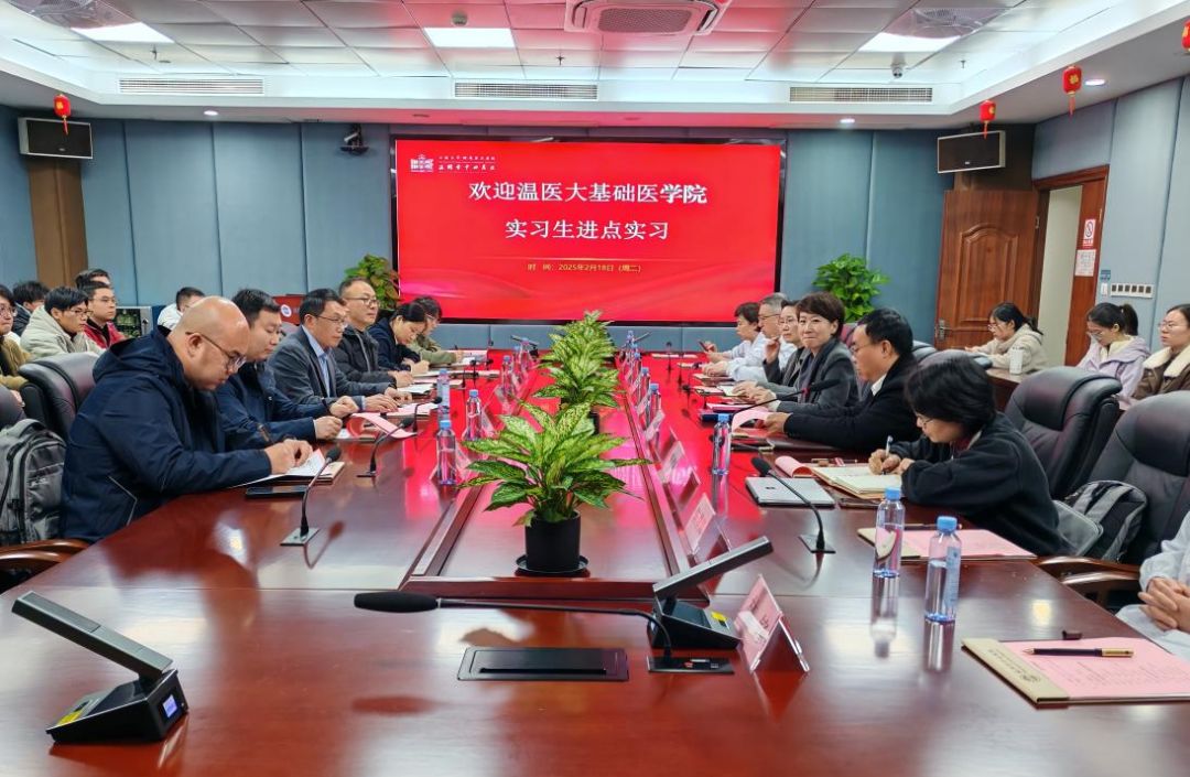 院长薛向阳、党委副书记黄宝兴、副院长蒋朋飞及相关人员专程前往温州市中心医院,参加基础医学专业实习生进点欢迎会。温州市中心医院党委书记沈淑蓉、党委委员、副院长张立群出席会议,医院教学管理部门负责人及各临床教研室主任、教学秘书、2021级基础医学专业全体学生共同参会。会议由温州市中心医院科教科科长王凯华主持。