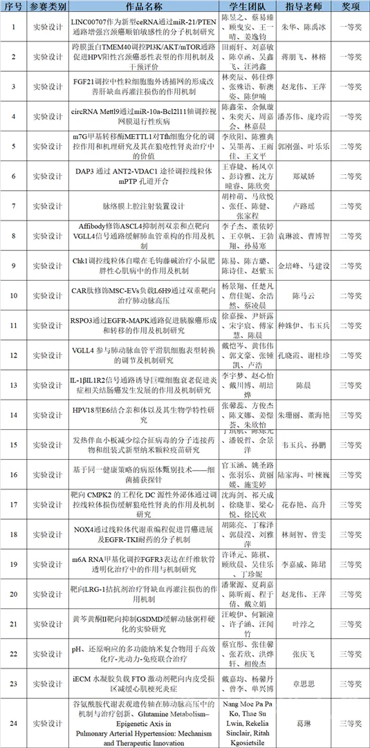 比赛设创新研究和实验设计两个组别,分设基础临床、交叉学科、口腔医学、药学与中医药、法医学及“一带一路”等亚组。各参赛队从立项依据、技术路线、实验结果、创新性、应用性和团队协作等多个维度进行展示,现场汇报PPT、回答评委提问。最终30个优秀项目脱颖而出,其中实验设计组最终评选出一等奖4项、二等奖8项、三等奖12项,创新研究组最终评选出一等奖1项、二等奖2项、三等奖3项。