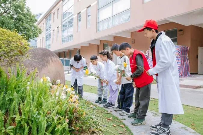 在学校实验动物纪念碑前,机能实验教学中心的庞老师带领着大学生与小学生一起向实验动物纪念碑献上鲜花,大手牵小手共同为实验动物默哀,表达对生命的敬意。