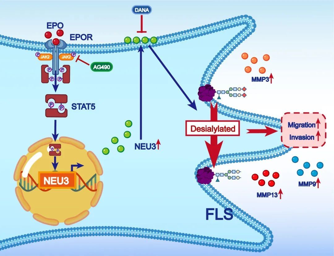 在机制上,研究团队通过对EPO干预的滑膜成纤维细胞进行RNA-seq,发现EPO上调神经氨酸酶3(Neuraminidase 3,NEU3)的表达,引起滑膜成纤维细胞唾液酸化水平的降低,促进其迁移侵袭能力的增加,从而促进RA的疾病进程,抑制NEU3的表达与功能可以逆转这一表型。最后,研究团队明确了促进NEU3转录的转录因子STAT5,并发现EPO是通过结合EPOR激活JAK2-STAT5通路发挥上述功能,而这一过程可以被JAK2抑制剂和巴瑞替尼所逆转。