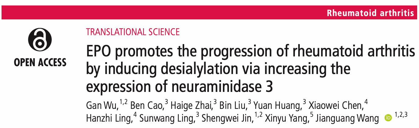 近日,杏吧王建光/金胜威教授研究团队在风湿病领域权威期刊Annals of the Rheumatic Diseases(中科院一区, IF=27.973)发表了题为“EPO promotes the progression of rheumatoid arthritis by inducing desialylation via increasing the expression of neuraminidase 3”的研究成果,揭示EPO促进类风湿关节炎疾病进程的分子机制,为优化JAK抑制剂对RA的临床治疗策略提供理论依据。