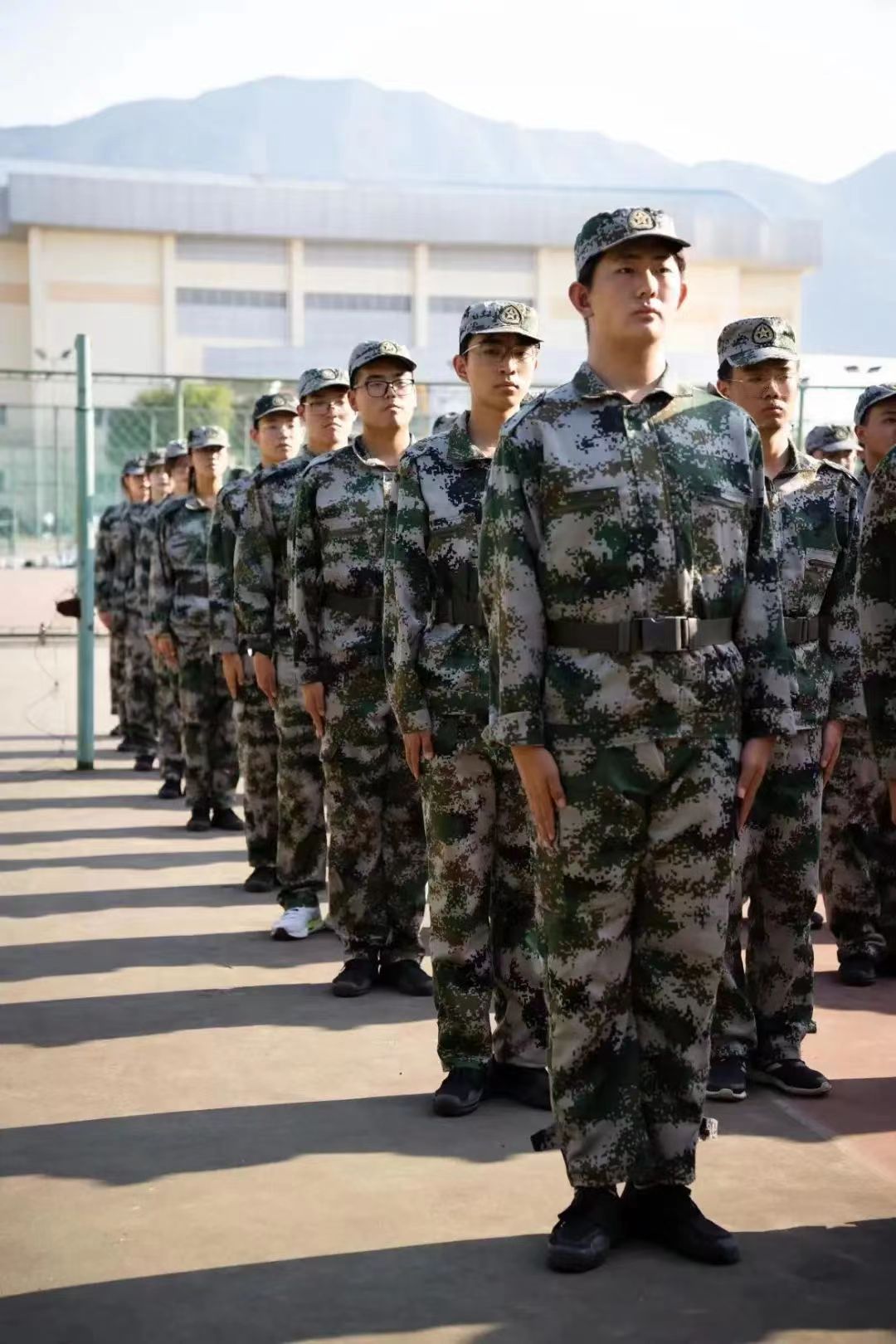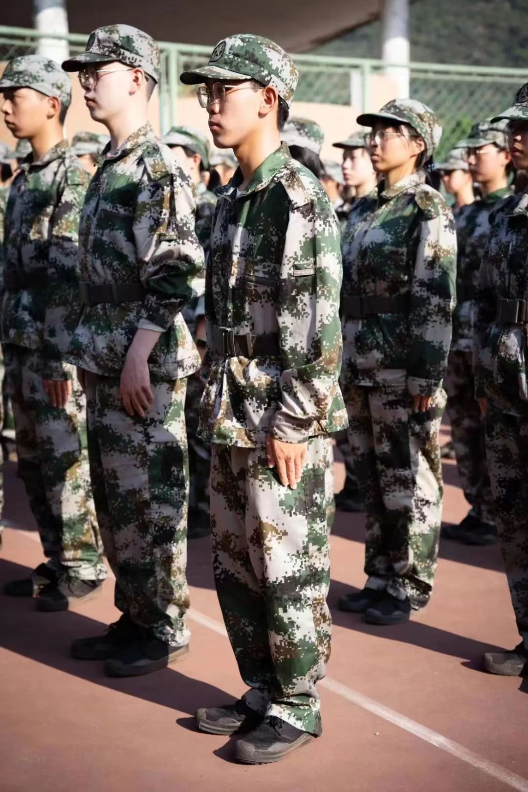 换上迷彩服,戴上训练帽