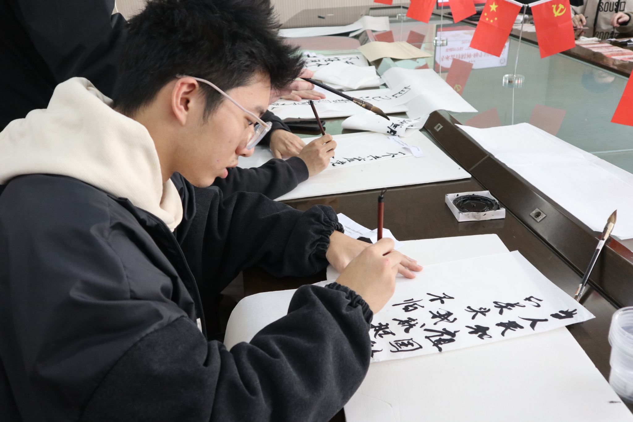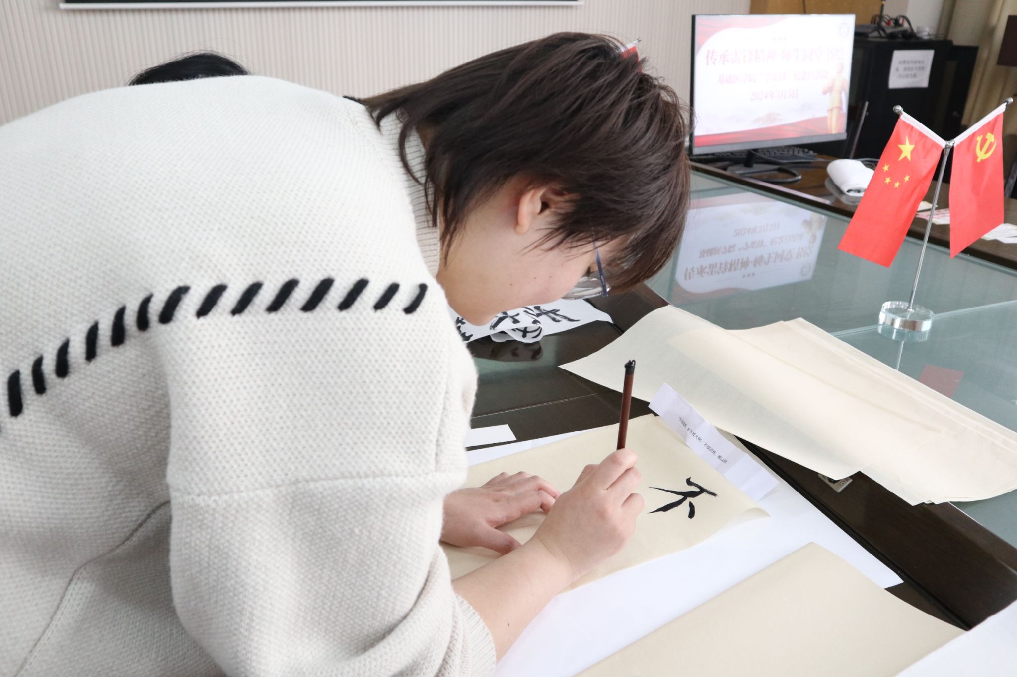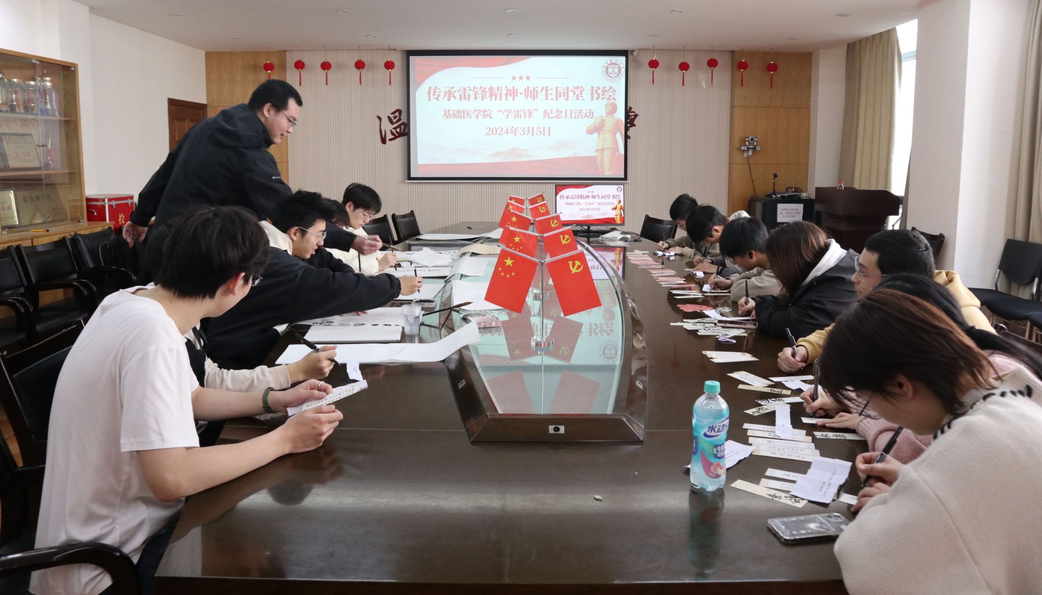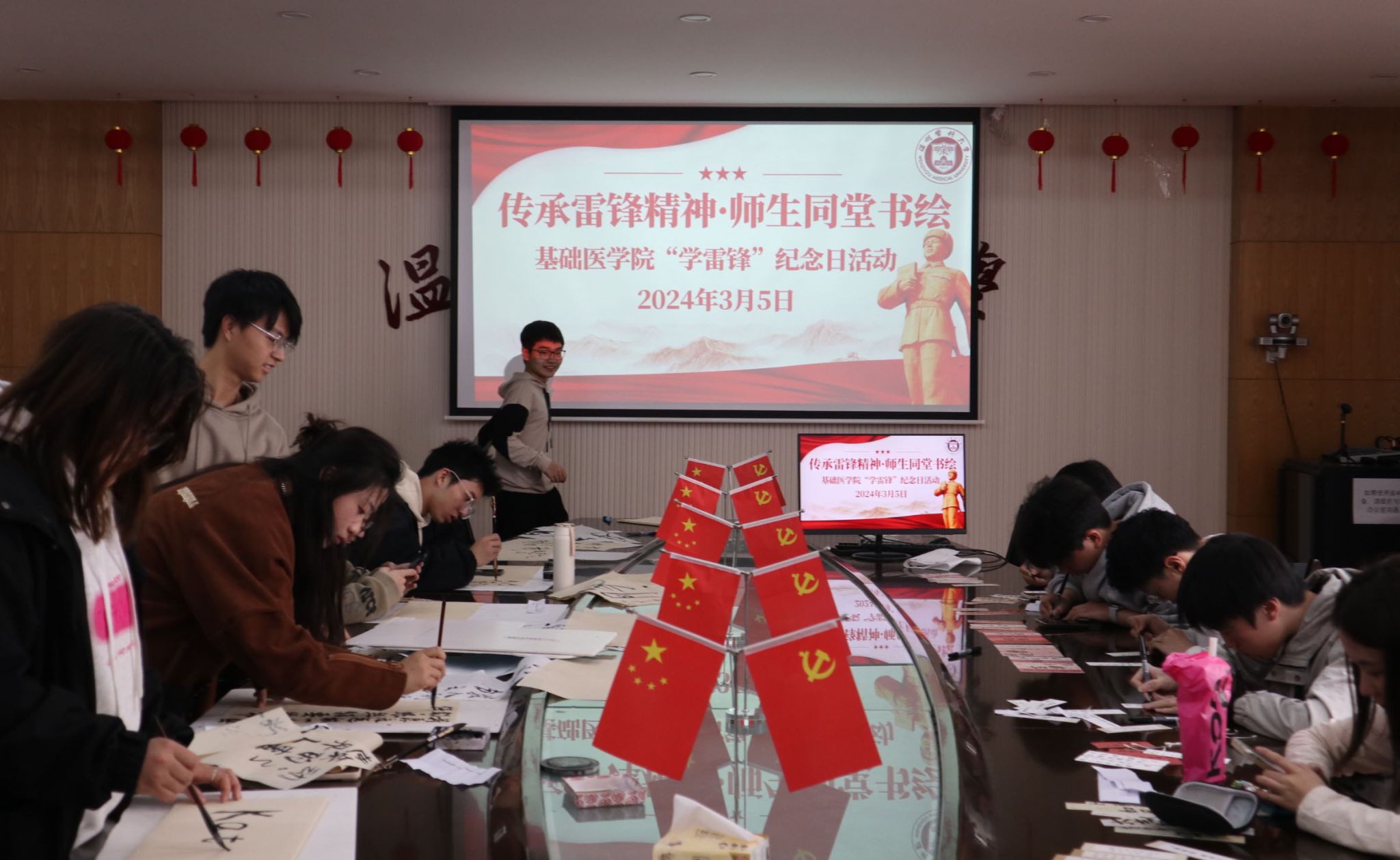 各位师生携手开展的“雷锋精神”传承活动,基础师生通过书画交流传扬雷锋精神。