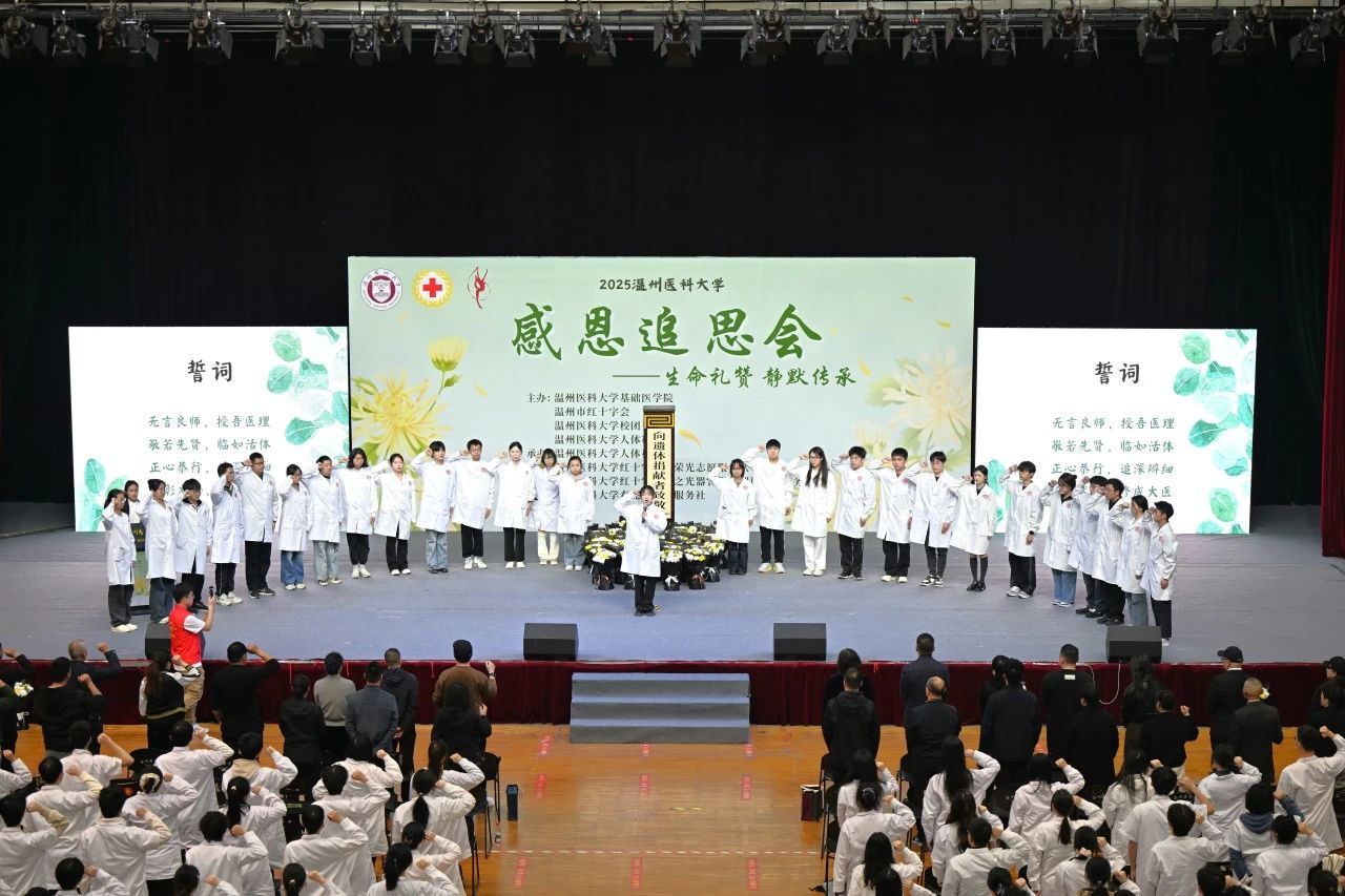 千名师生与七位遗体捐献者的家属共聚学生活动中心,在庄重和肃穆中完成了这场感恩追思会。校党委委员、宣传部(教师工作部)部长李军红,温州市红十字会、校团委、杏吧