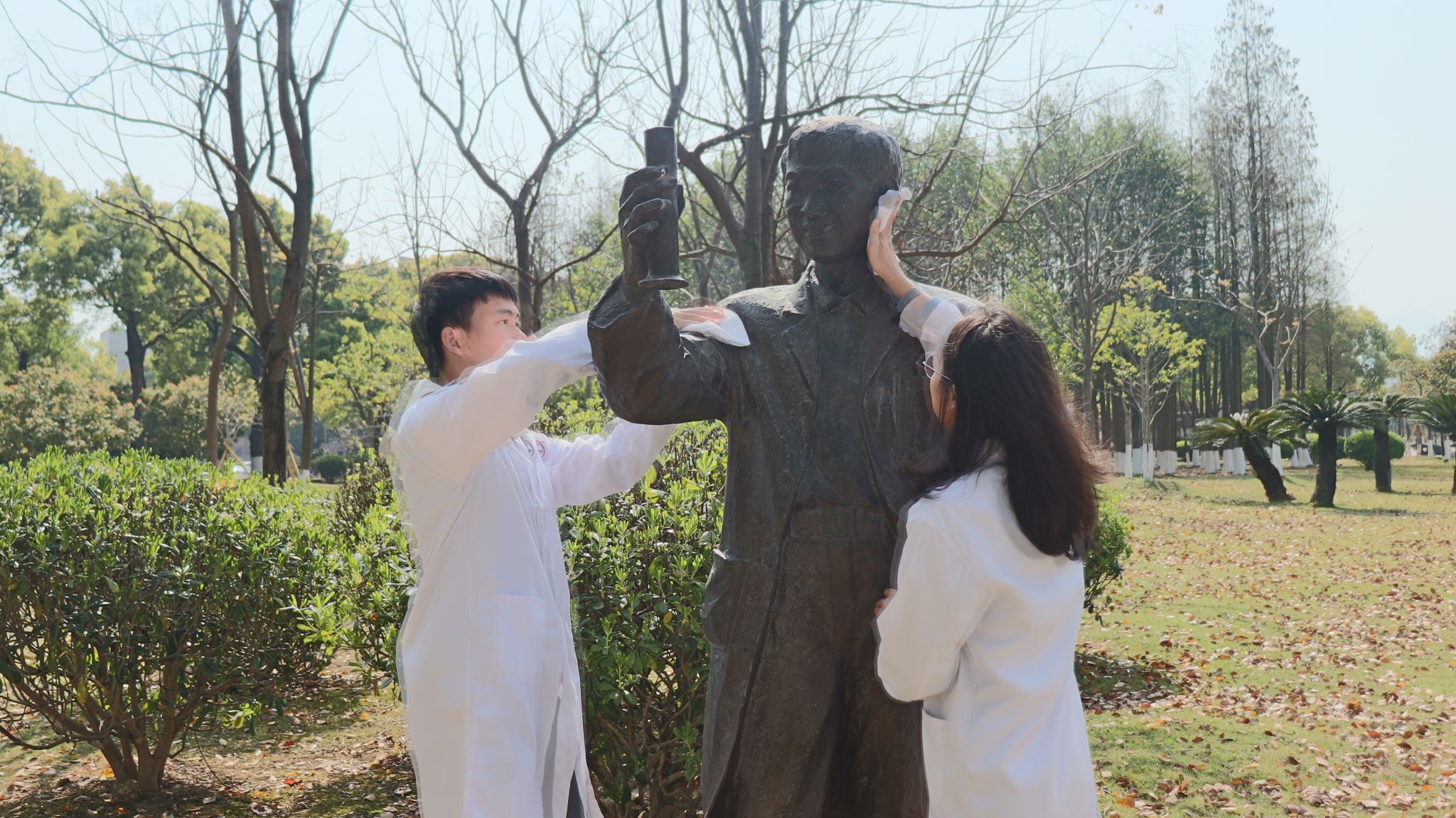聆听完周健博士的事迹后,现场的同学们在周健博士铜像前整齐排列,低头默哀,全场一片寂静。在这无声的追思里,同学们深刻感受到周健博士作为医学科学家,在攻克宫颈癌,追踪人类乳头状瘤病毒等领域潜心钻研的精神,也对他为推动医学进步做出的巨大贡献有了更深的认识。两位学生代表神情庄重,缓缓走上前,用柔软的布轻轻擦拭周健博士铜像,每一个动作都饱含着敬重。