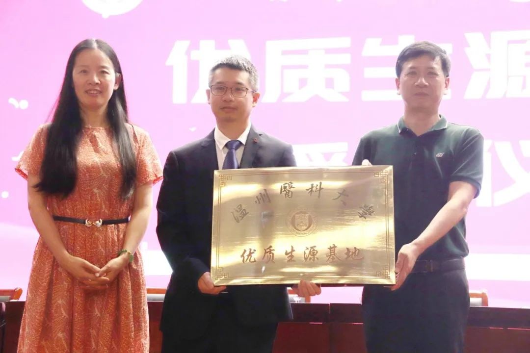 在天台中学在校学生的共同见证下,金献测副院长和天台中学副校长张仁明、陈梦丹签订了优质生源基地建设协议书,并举行了授牌仪式。