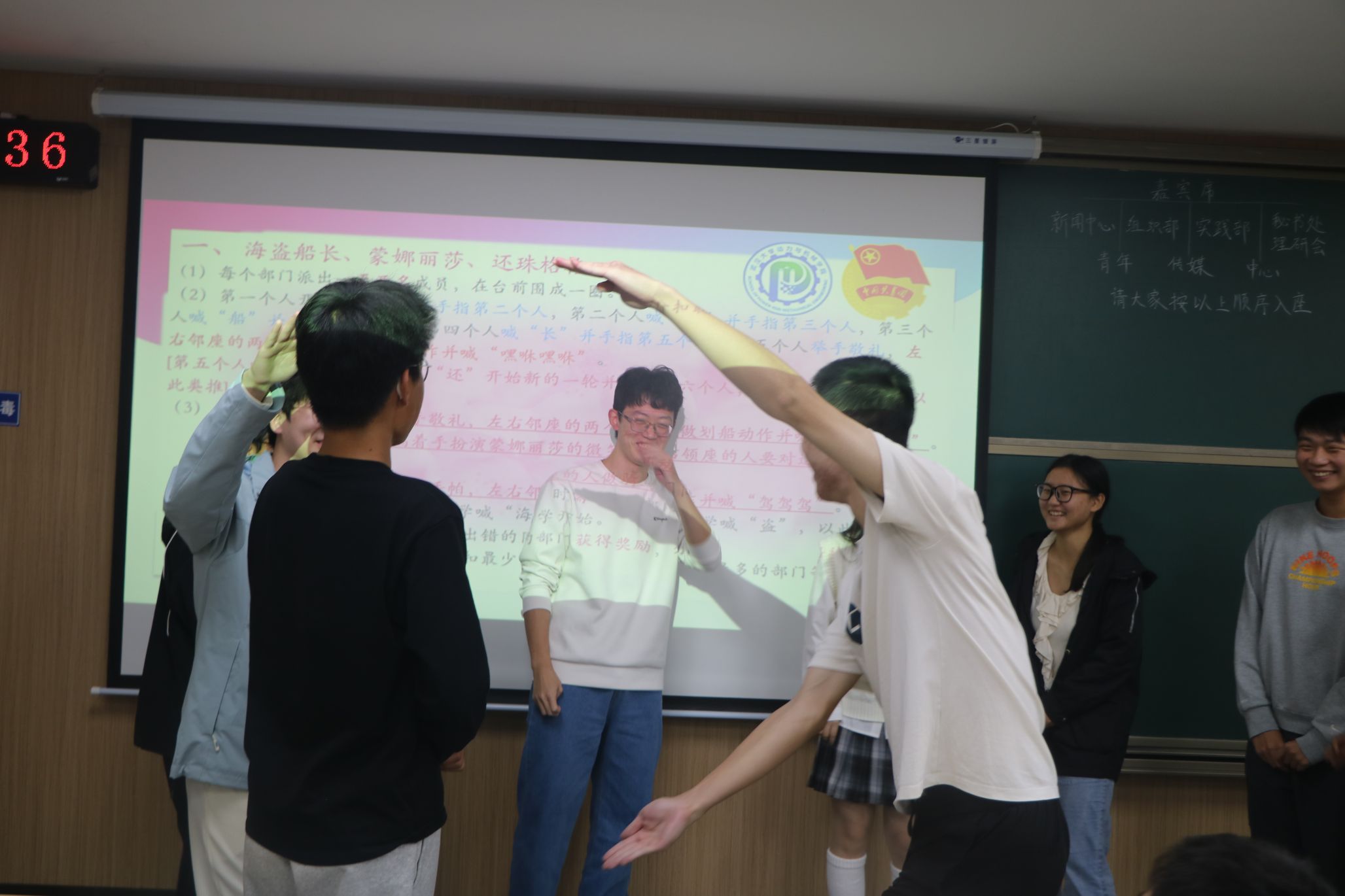 介绍环节结束后,一曲由霍楷文、张祎旻带来的合奏《忒修斯的船》为会议增添了浓厚的艺术氛围。紧接着,游戏环节缓缓拉开序幕。通过“海盗船长”、寻物游戏及你画我猜等趣味横生的游戏,成员们之间的气氛逐渐变得热烈而欢乐。各个部门之间或合作或竞争,部门内主要负责人与部委间的联系也变得更加紧密。游戏环节圆满成功,充分达到了活动的预期目的。