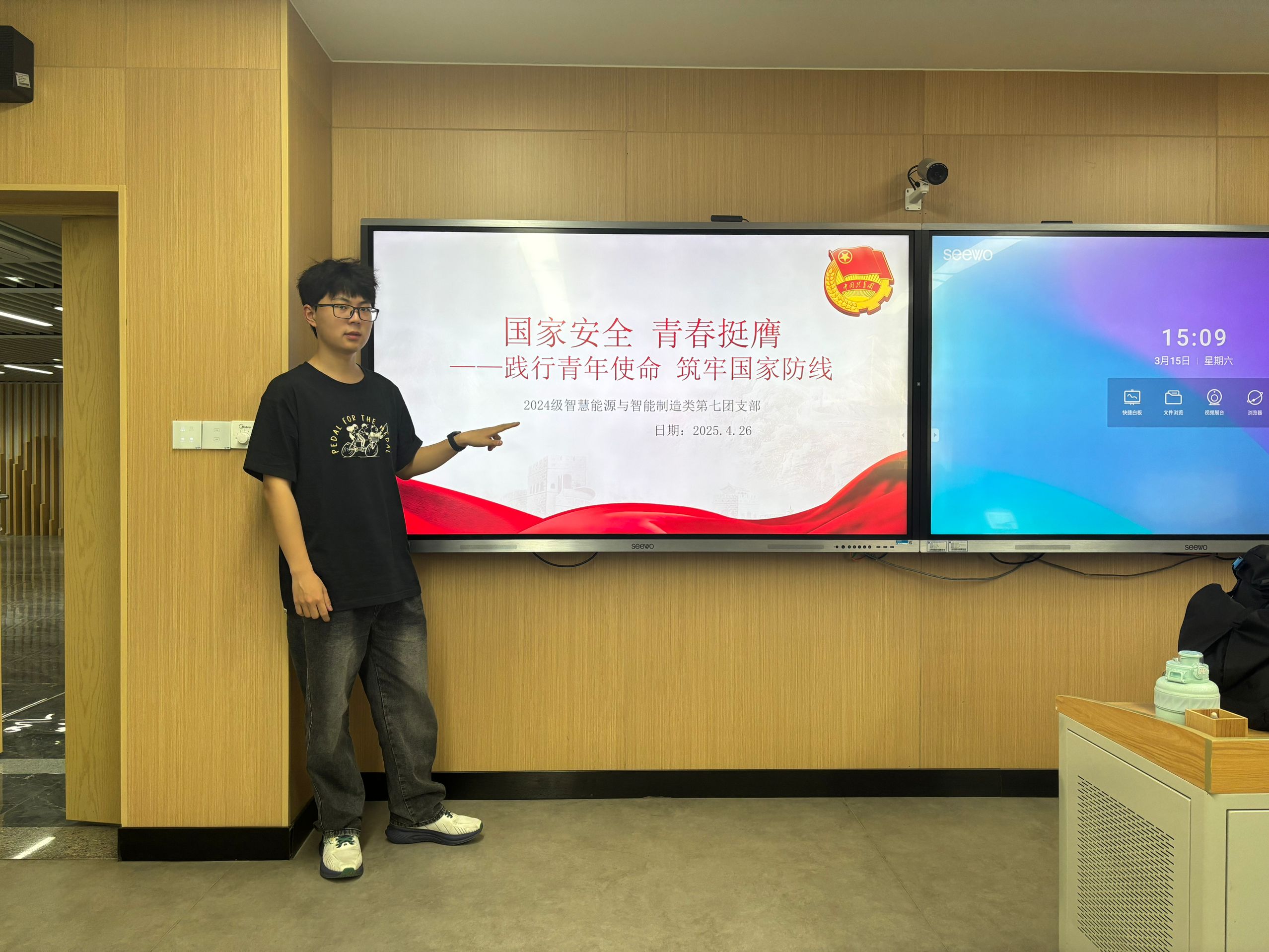 在理论学习环节,赵家晟带领团员青年们逐字研读《中华人民共和国国家安全法》核心条款,运用图表、案例分析等形式,详细解读公民维护国家安全的法定义务与权利保障机制。他特别强调团员青年在维护校园安全、防范境外渗透、保护科研成果等方面的特殊责任,呼吁团员青年们提高警惕,增强保密意识。