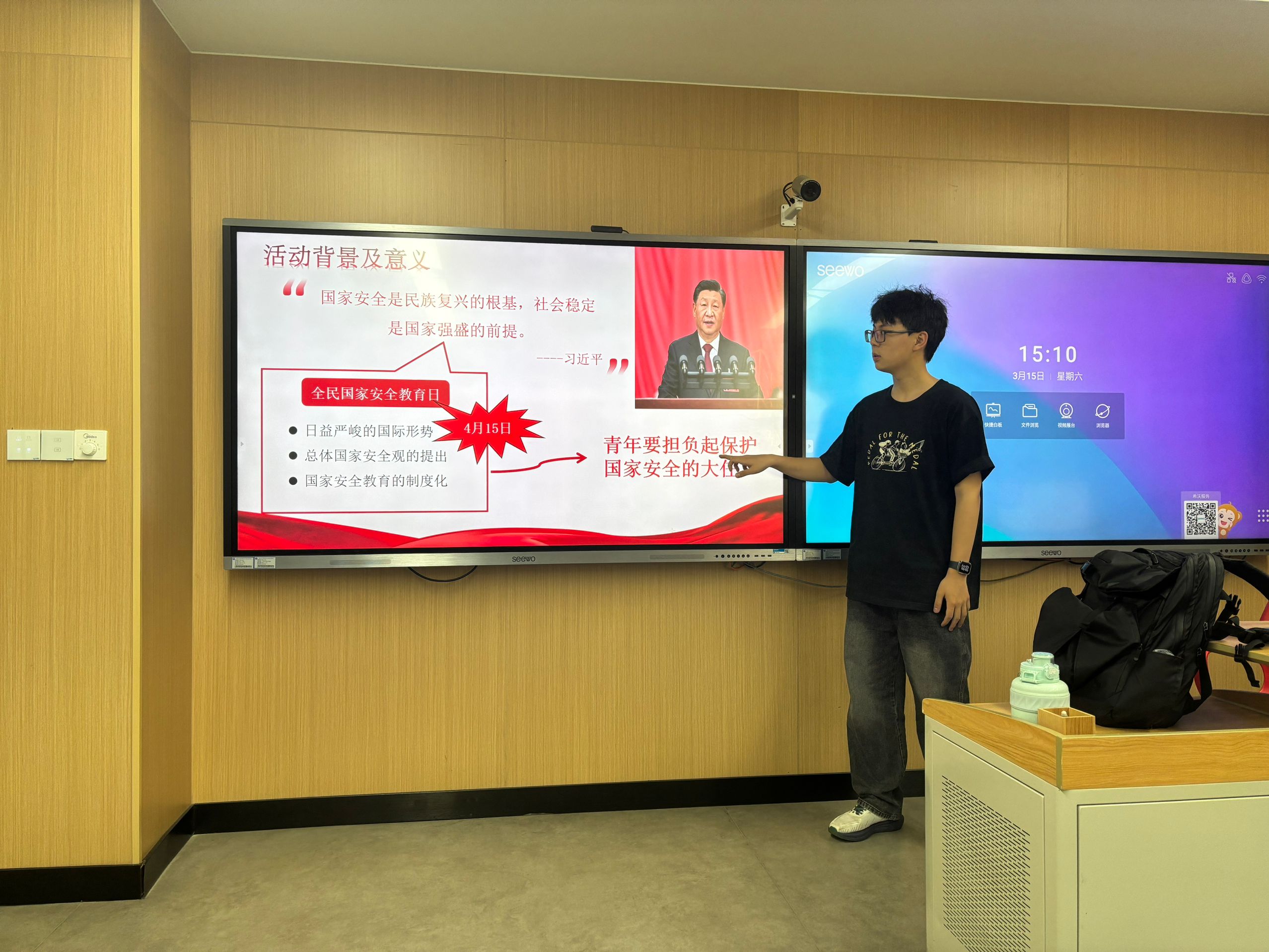 活动伊始,赵家晟简要回顾了全民国家安全教育日的设立背景与历史意义,指出该纪念日是凝聚全民安全共识、汇聚国家安全力量的重要契机。他结合近期社会热点事件,深入浅出地阐述了国家安全的丰富内涵,从政治安全、国土安全等传统安全领域延伸至网络空间、数据隐私等非传统安全维度,使团员青年们深刻认识到国家安全与日常生活息息相关。