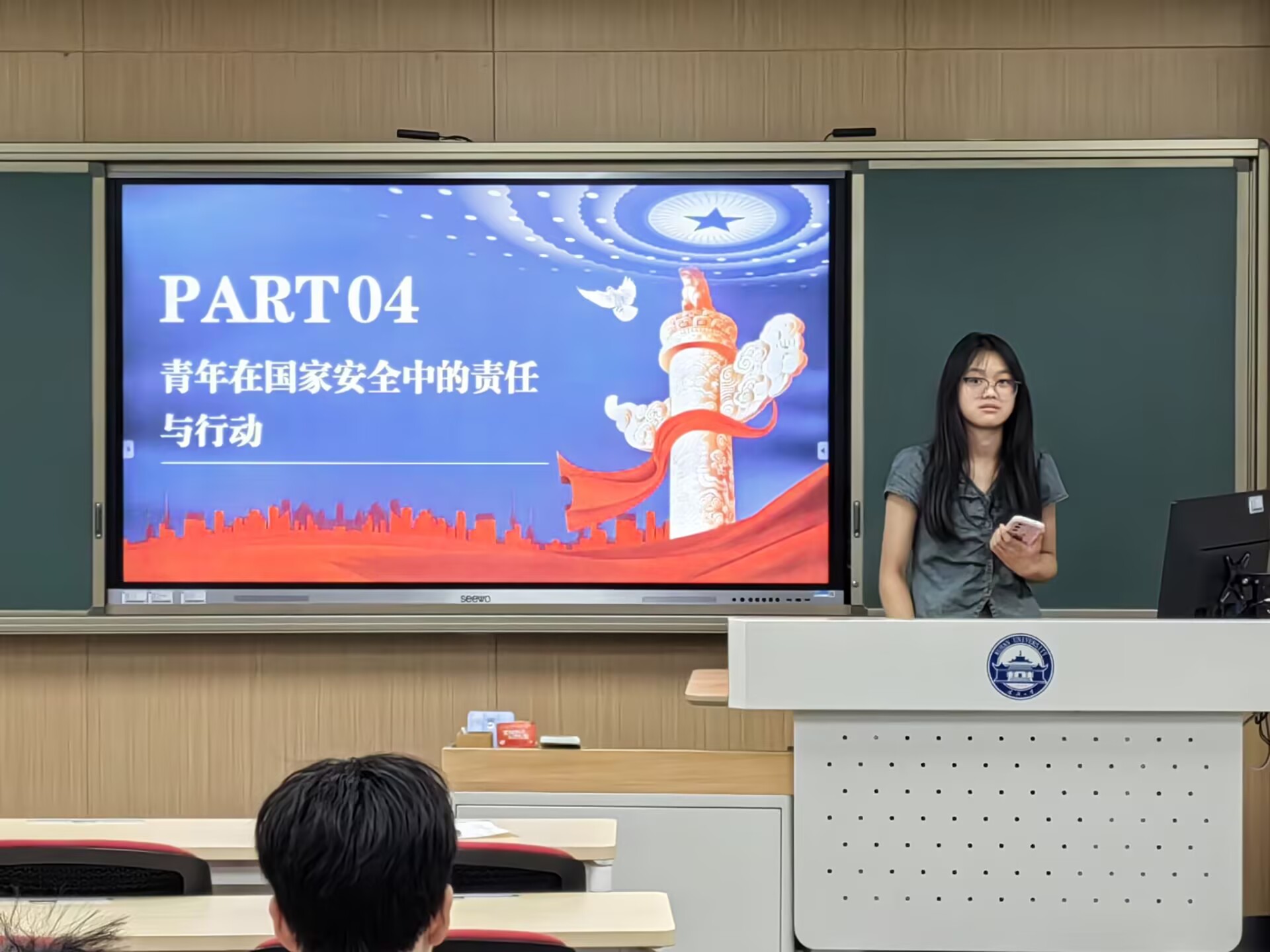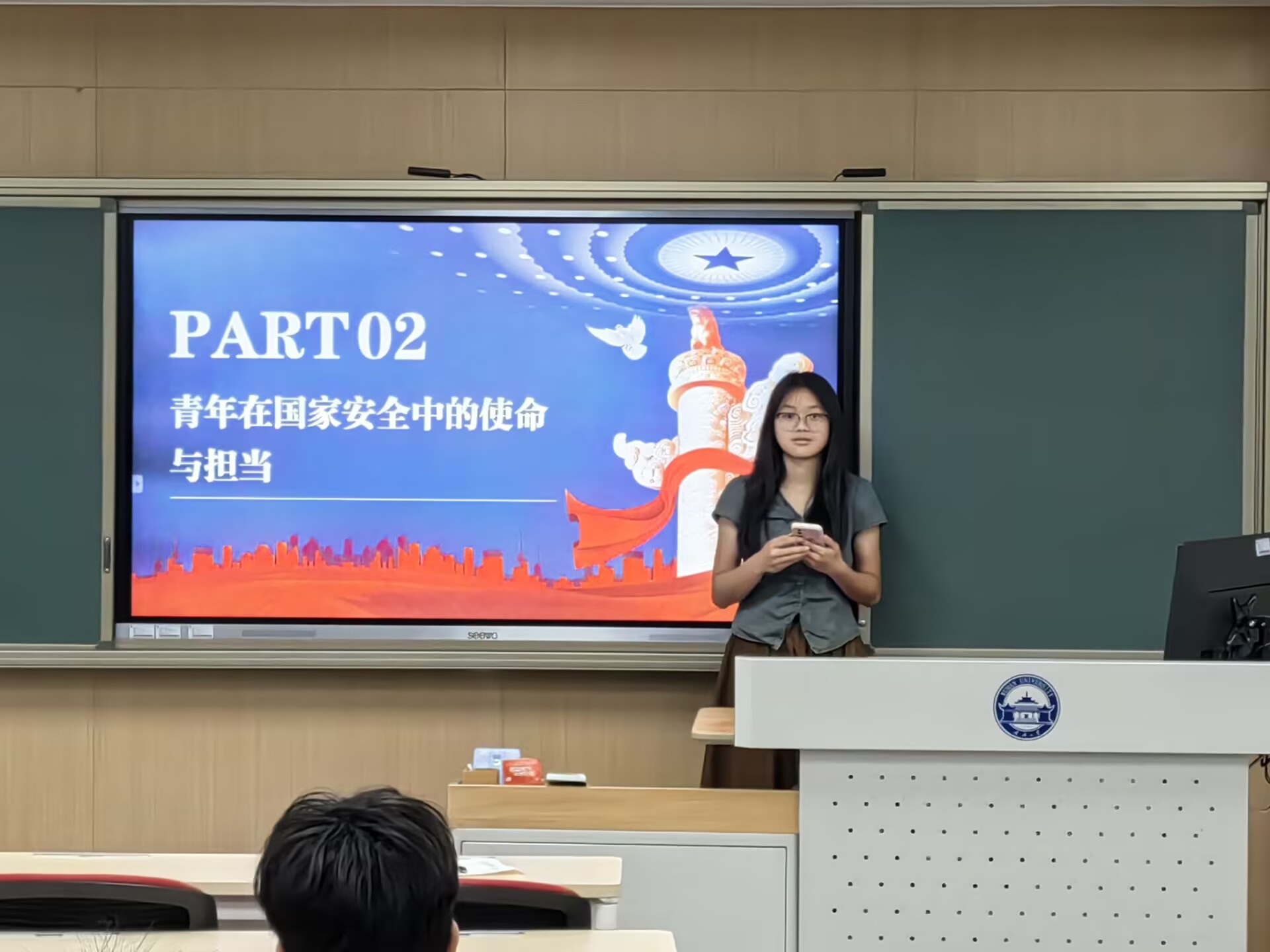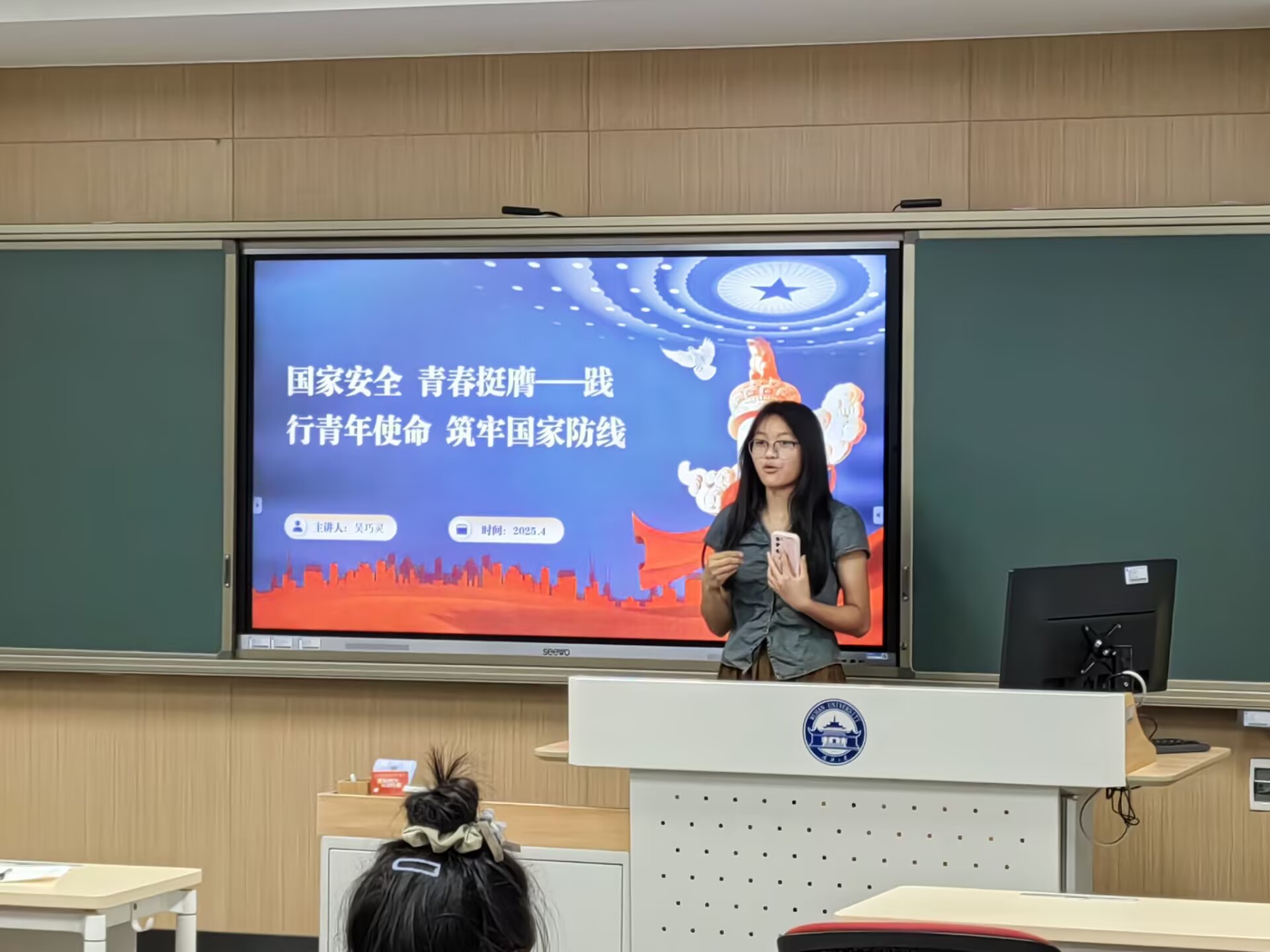 随后,吴巧灵自然地切入到青年在国家安全中的使命与担当这一主题,以历史中的著名人物和近代抗战时期的青年为例子,她提倡团员青年们积极参观红色教育基地,参与主题演讲活动,在日常生活中以英雄为榜样,树立正确的价值观,增强国家安全意识,自觉抵制各种危害国家安全的行为,呼吁团员青年们积极融入国家安全事业。
