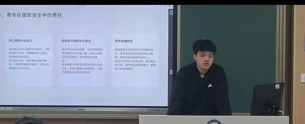 同时,谢翰瑜揭示当代国家安全面临国际形势复杂、非传统安全威胁等挑战,明确青年在树立意识、参与建设、传承爱国精神方面的责任。