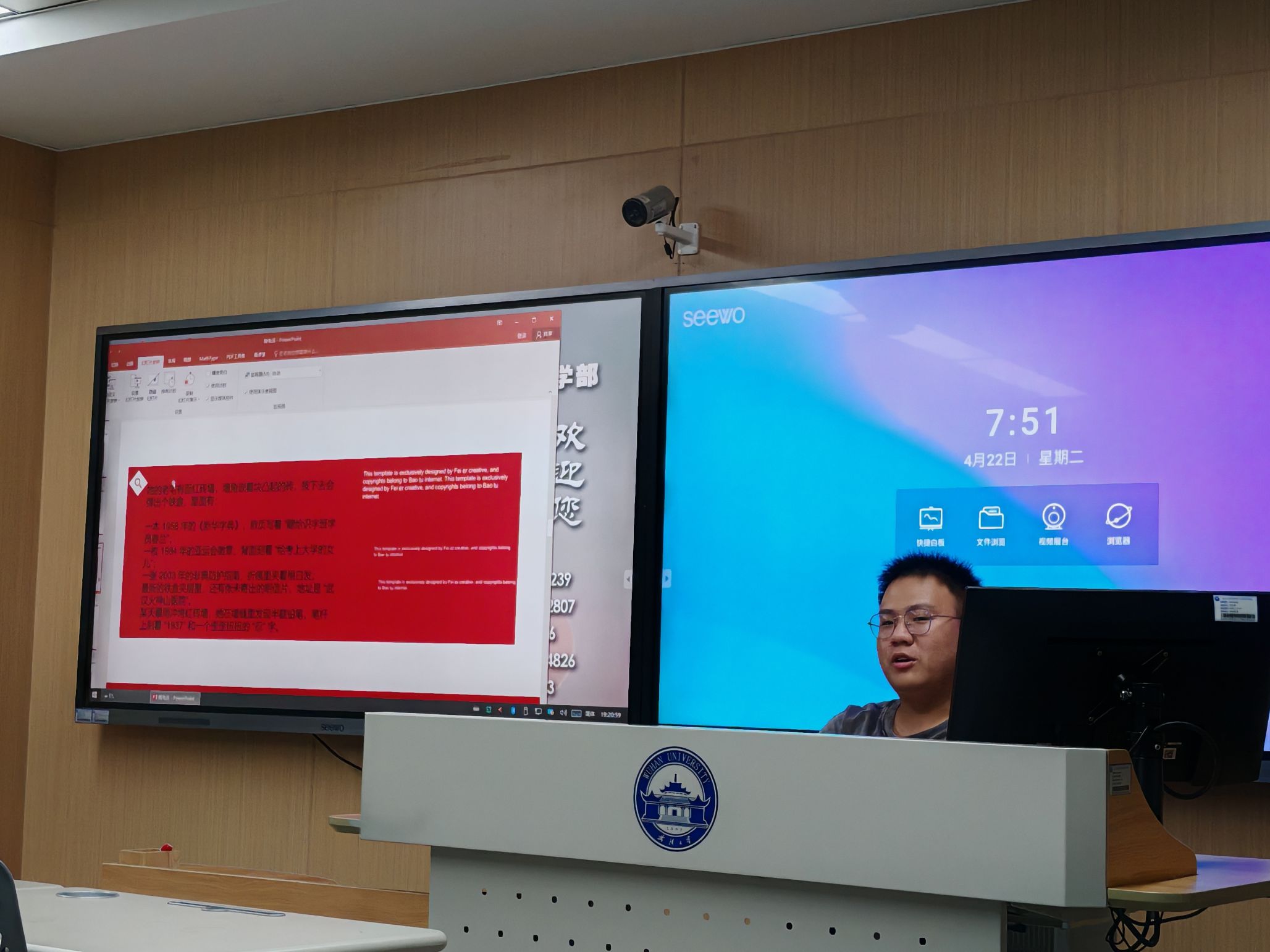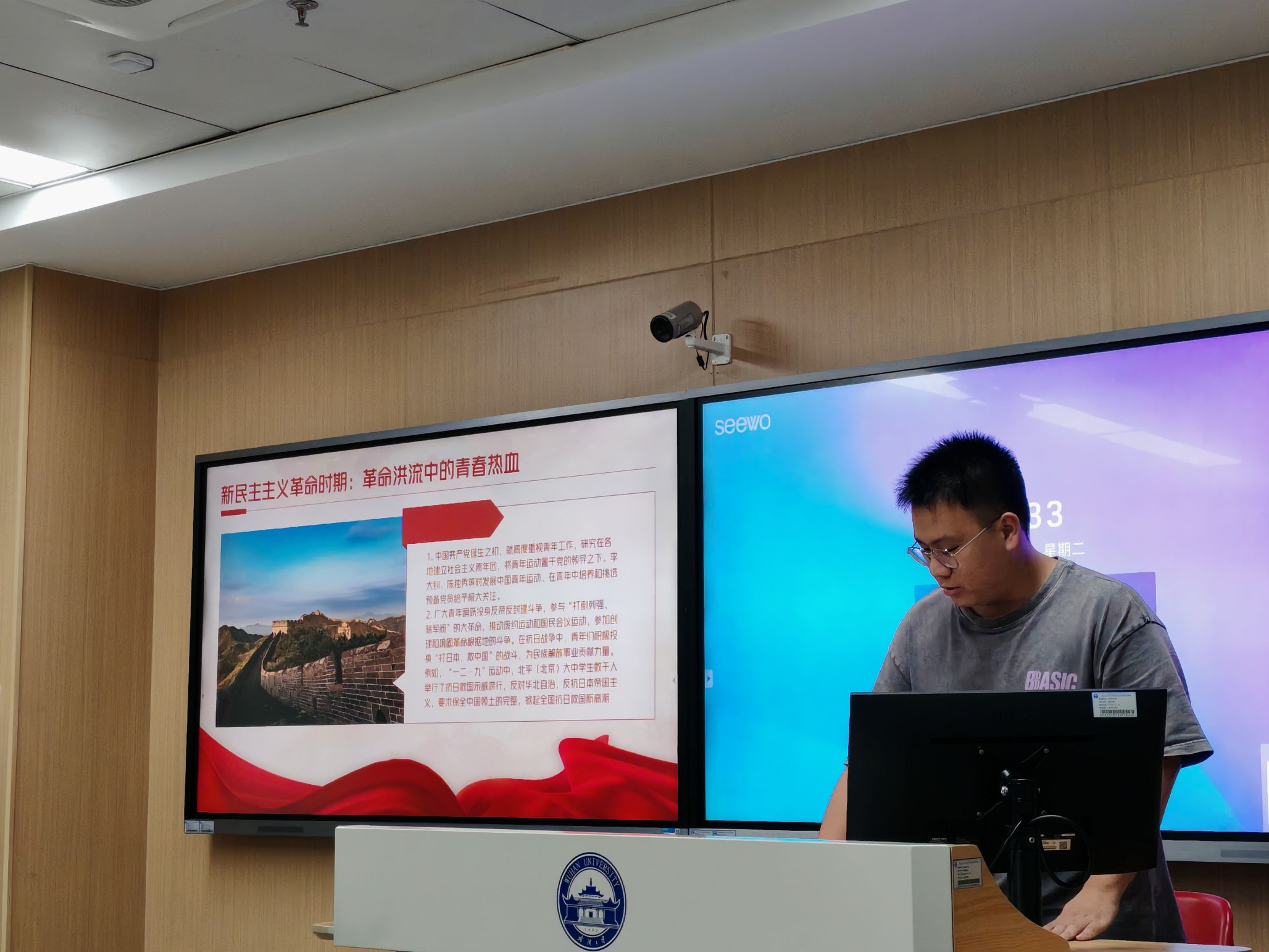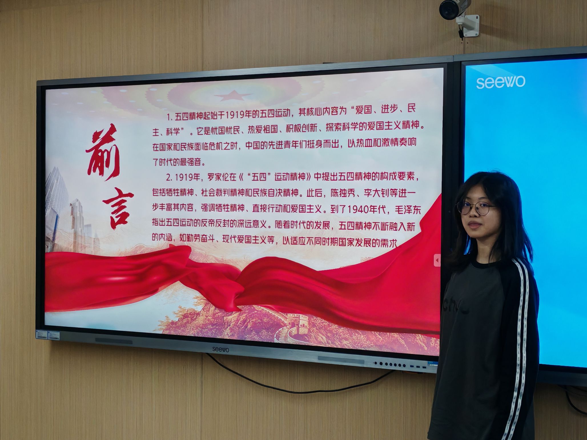 接着占添祥与团员青年们分享了中国青年在不同历史时期为国家独立、民族复兴和社会进步不懈奋斗的视频。视频从1919年五四运动的热血场景起步,展示了青年学生在国家危难时刻的挺身而出,回顾了新民主主义革命时期广大青年在反帝反封建斗争中的英勇事迹,呈现了新时代青年在科技创新、乡村振兴等领域的卓越贡献。陈泓冰在视频的结尾阐述了自己的感想:“家是最小国,国是千万家。每一个丰功伟绩的背后都潜藏着无数利长远的潜功基业。弱国无外交,若是我们国家仍旧如同百年前那般孱弱,那么在当今的世界我们根本不会有反抗列强的勇气。当今世界,兵戎相见时有发生,冷战思维和强权政治阴魂不散,恐怖主义、难民危机、重大传染性疾病、气候变化等非传统安全威胁持续蔓延。种种景象深刻启示我们:没有国家安全的基础,任何美好蓝图都是空中楼阁。”