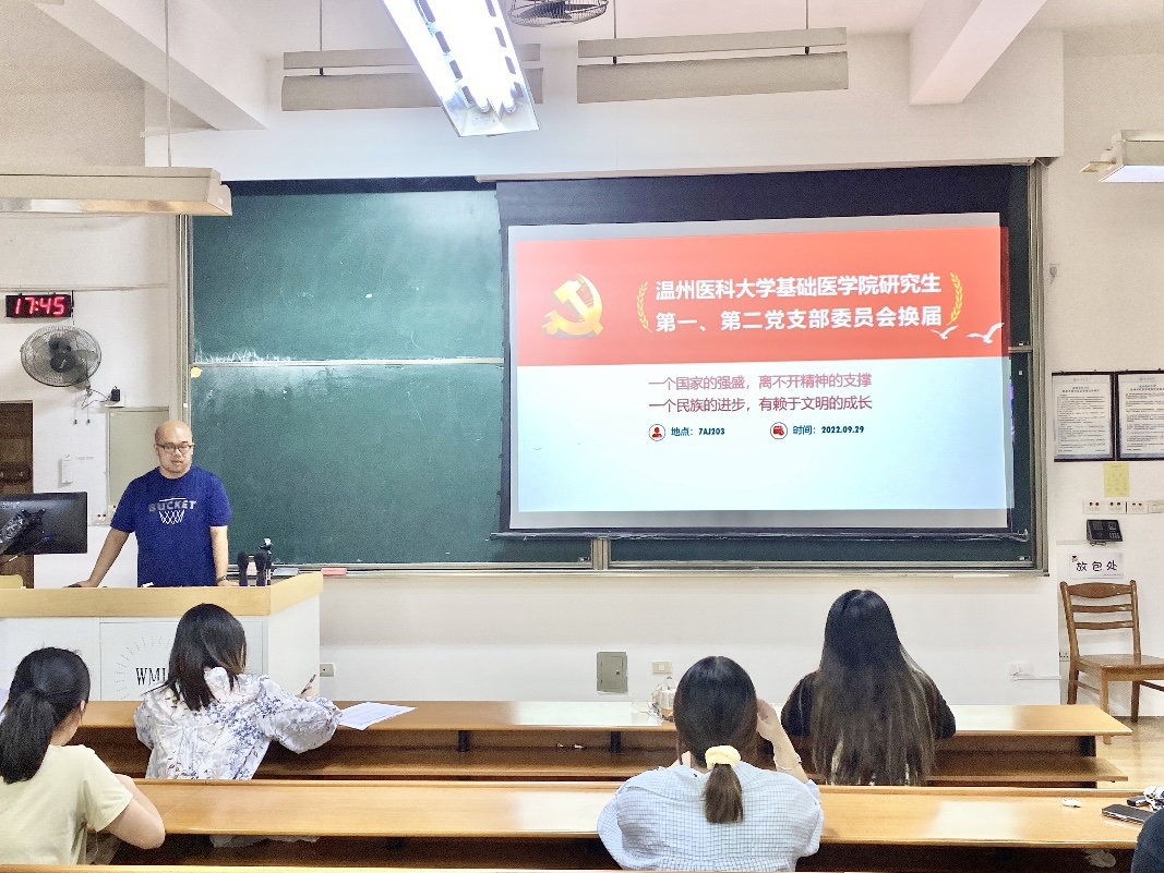 研究生第一、二党支部于9月29日下午召开新一届支部支委换届大会。本次会议由第二党支部书记彭翔主持,第一党支部书记赵威老师,各支部副书记、支委及全体党员参会。