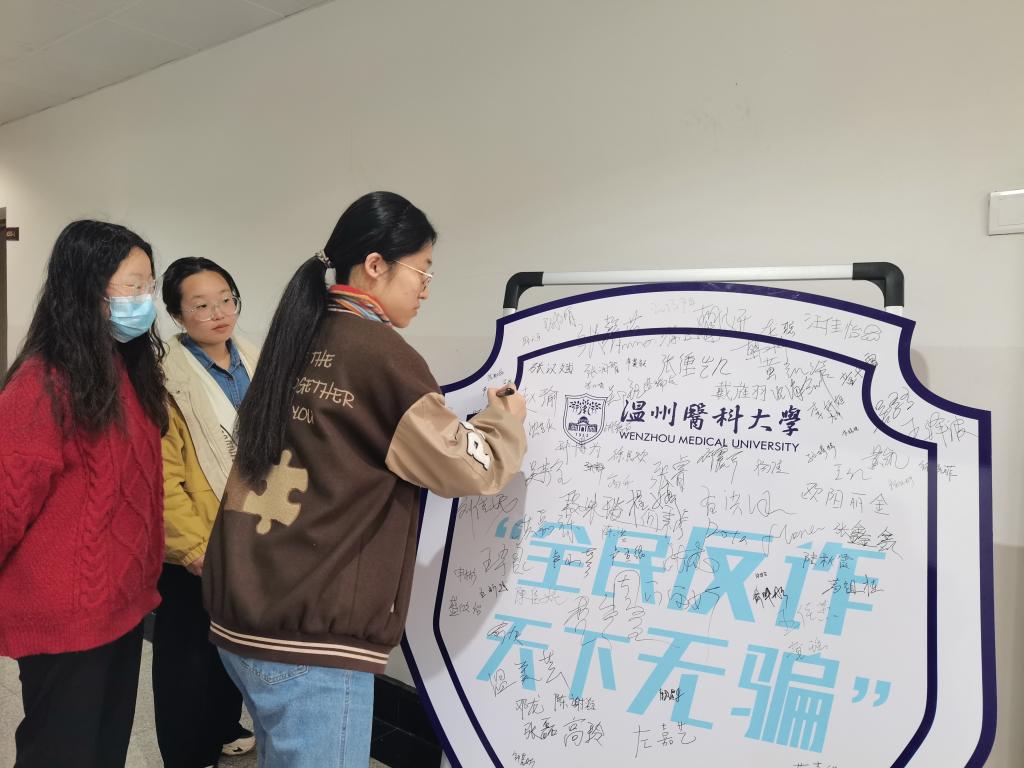 活动现场,还设置有防诈反骗宣传点,通过发放警示宣传册、手签承诺书等方式,促进学生防诈反骗意识的提高。