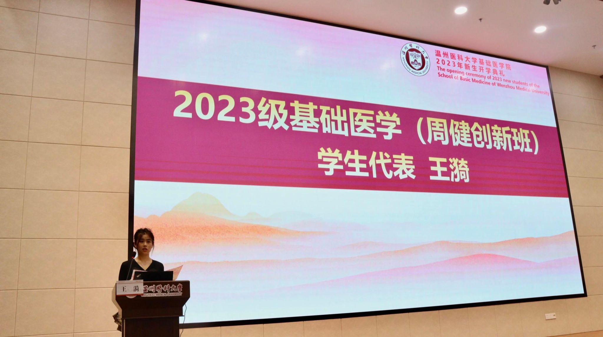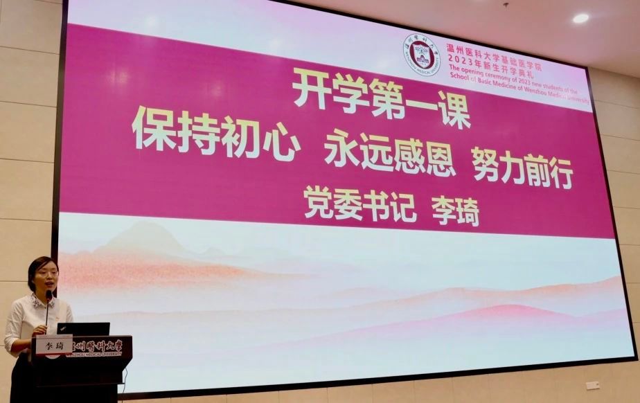 典礼伊始,李琦书记向新生讲授开学第一课。李琦书记分别从温州的人文、地理、温医大的百年历史传承、基础大先生以及“周健”精神等进行介绍,让新生快速融入新环境,接受温医大精神洗礼。她还殷切嘱托所有新生:一是在科研实验中要脚踏实地,做事创新;二是在学习生活中修炼品行,志存高远;三是树立目标时要放开眼界,放大格局。最后,她希望新同学能够传承温医大精神,成为堪当大任的时代新人。