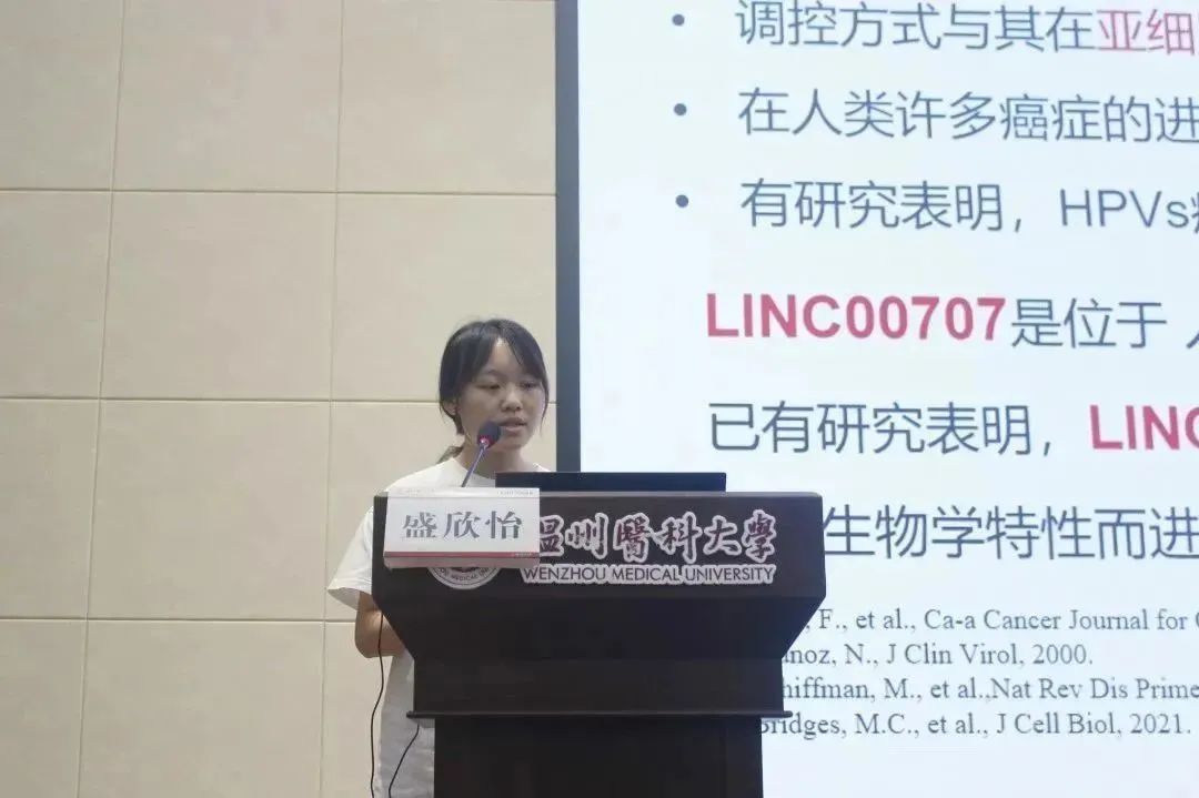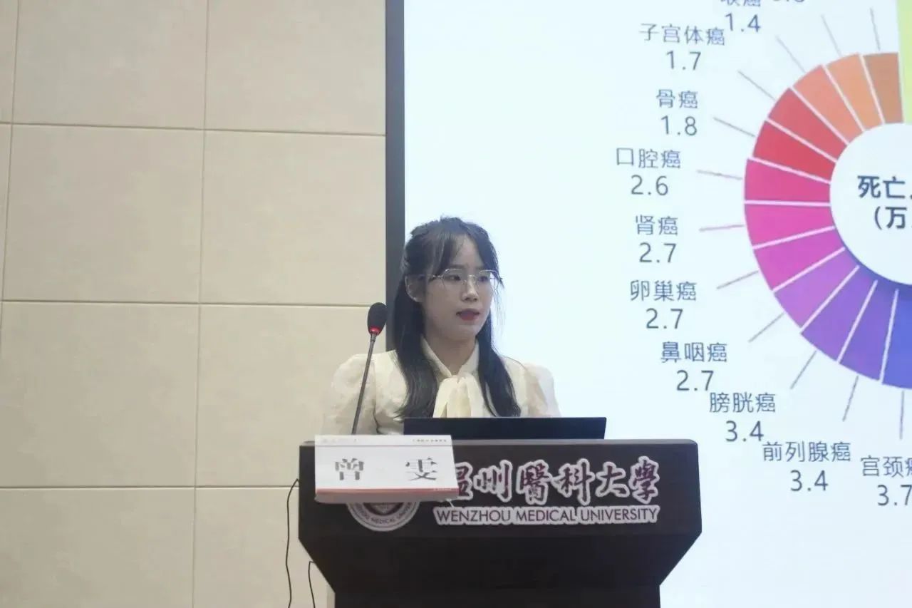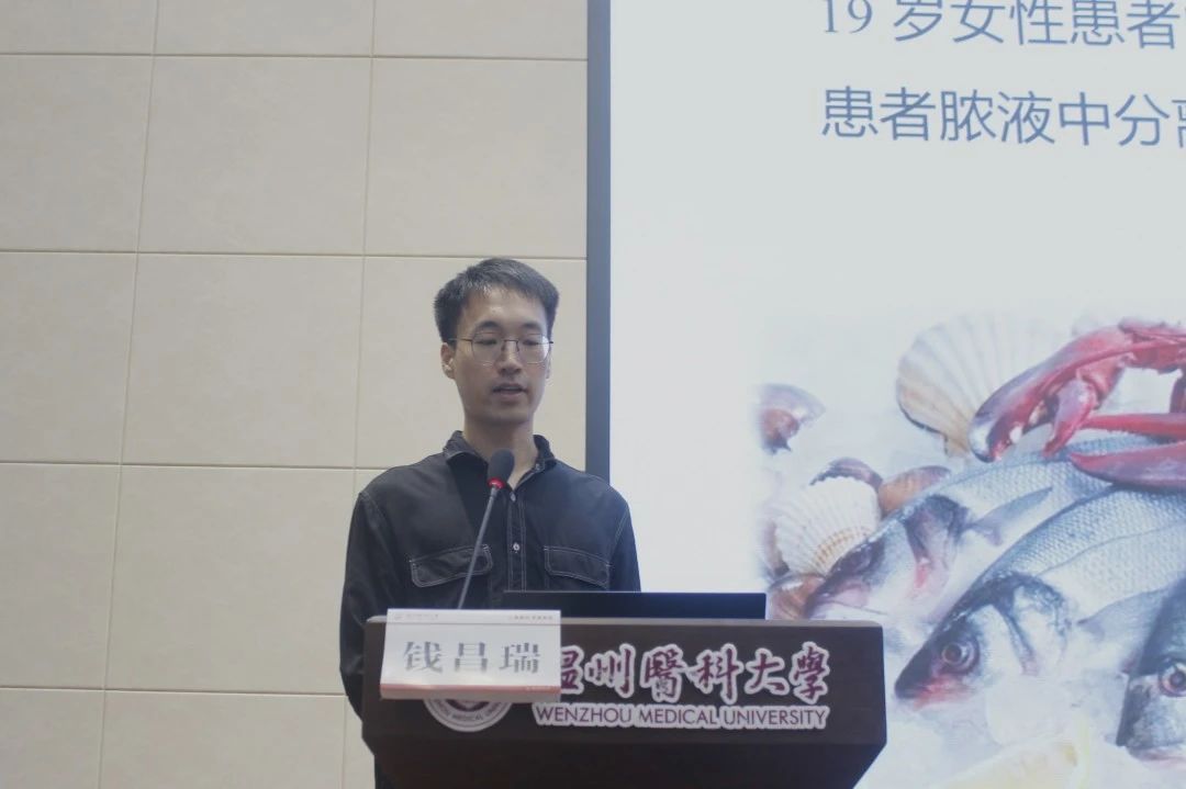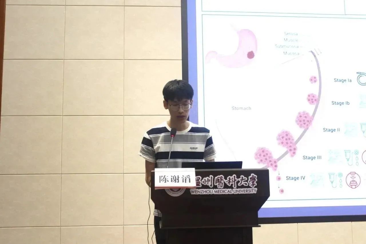风采展示,学术争锋。主持人介绍比赛规则后,参赛选手按照抽签序号依次上台进行汇报,并接受专家评委提问。八名参赛选手通过线上与线下结合的形式进行现场PPT汇报与答辩,在擂台上尽展学术风采,凸显温医大学子仁肃勤朴、求是奋发的精神,给观赛人员带来一场十分精彩的学术争霸盛宴。