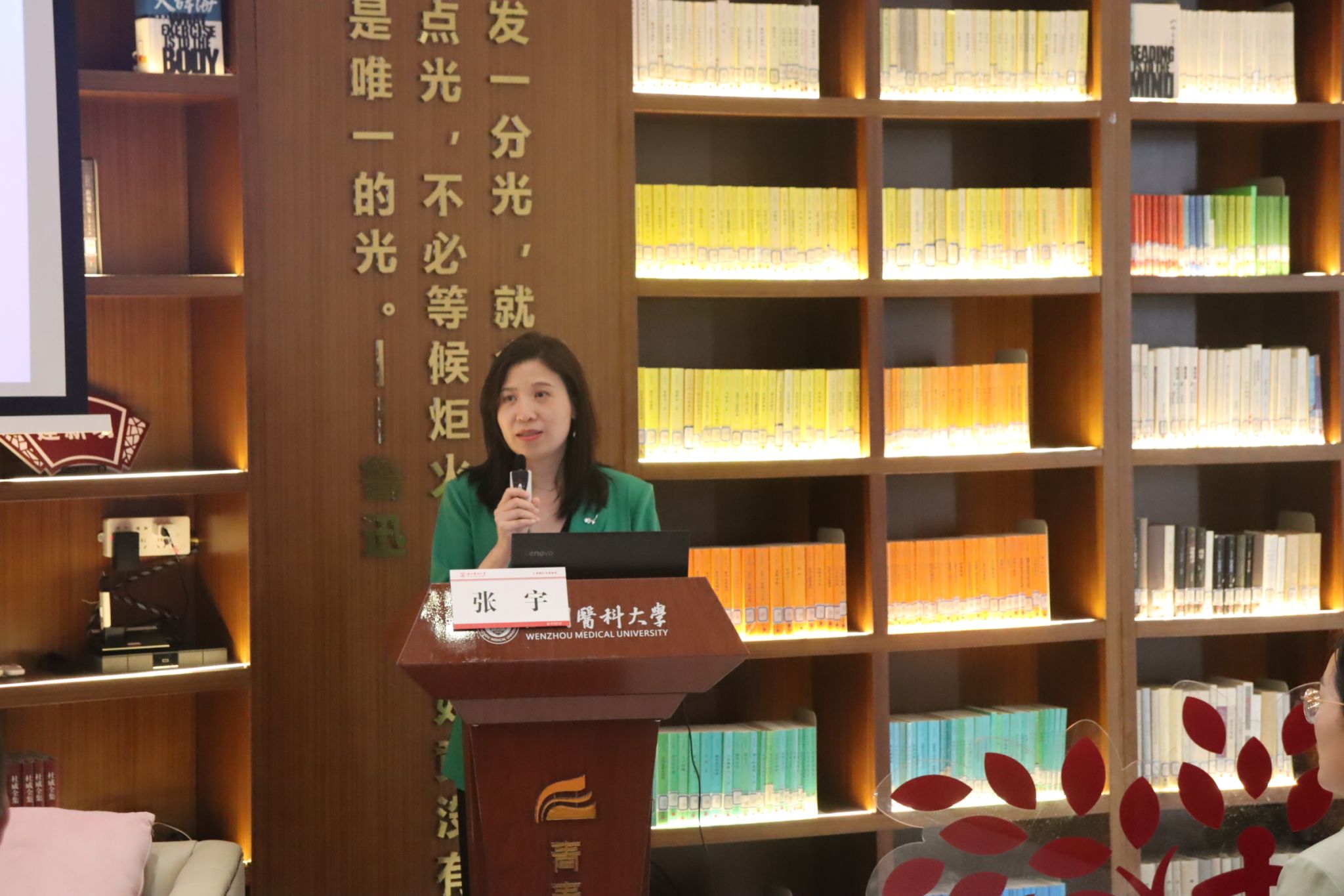 张宇校友首先简要介绍自己任职的德克萨斯医疗中心(TMC),以及自己在这家大医院从事基础研究的经历。她结合自身的成长与学弟学妹们共勉:第一,明确目标,将扎实完成学业目标和树立科研理想的长期目标相结合。第二,培养自身调节目标的能力。在不断变化的环境中学会适时对目标进行可行性分析并做出相应调整。同时,她强调了在基础研究中“交流”的重要性,尤其“soft skills”,在国外学习工作需要在社交活动中丰富研究思维。张宇校友还特别找出往日的温医同窗照片,回忆在温医一起奋进的岁月。