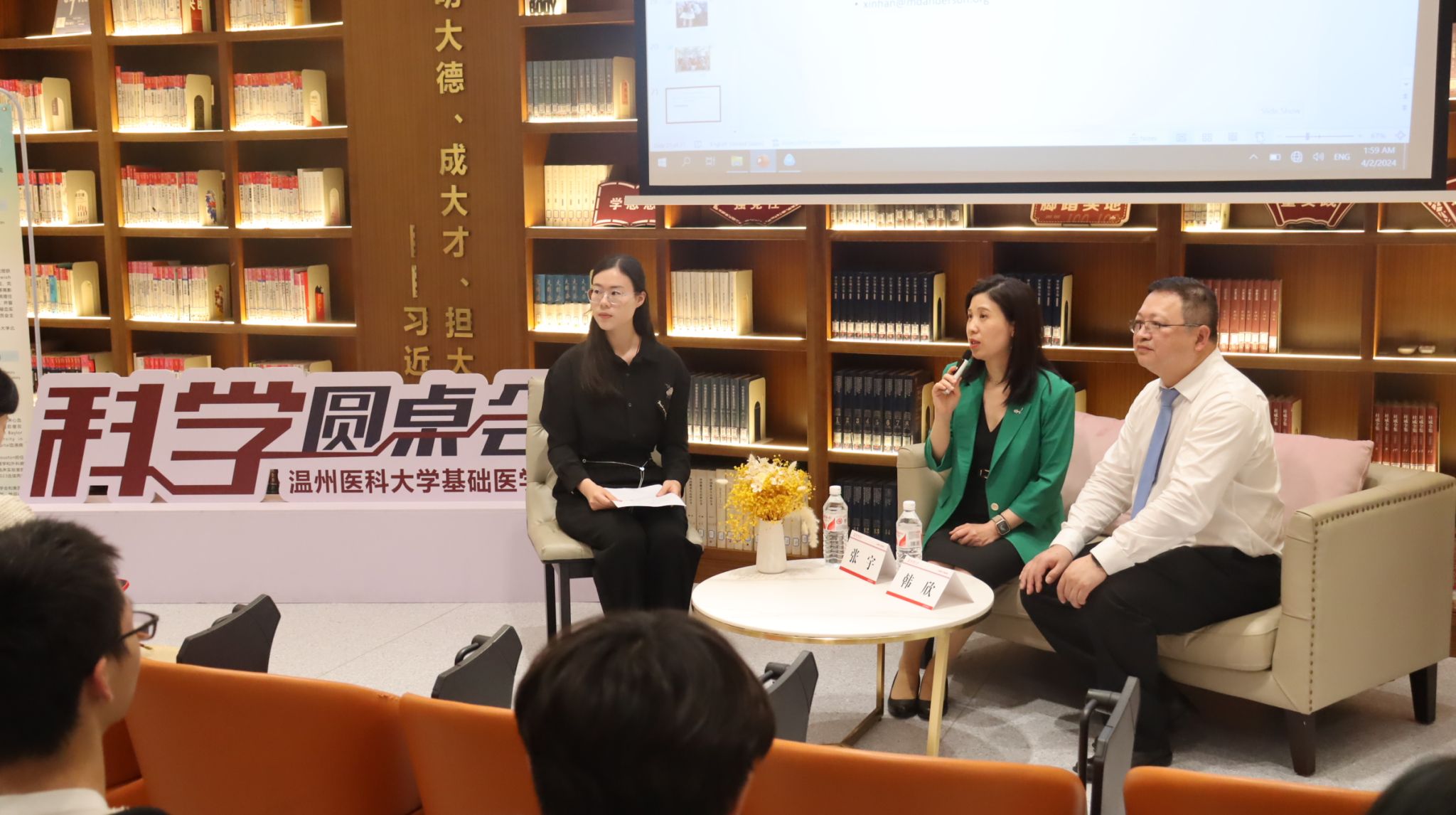 4月2日,杏吧 举行第十一期科学圆桌会学术沙龙,邀请到1987届校友、美国德克萨斯大学教授韩欣、张宇夫妇来院交流,分享在温医的学习生活经历和在美国做病理研究的心得体会。基础医学(周健创新班)本科生和部分硕士研究生代表到场参加活动。