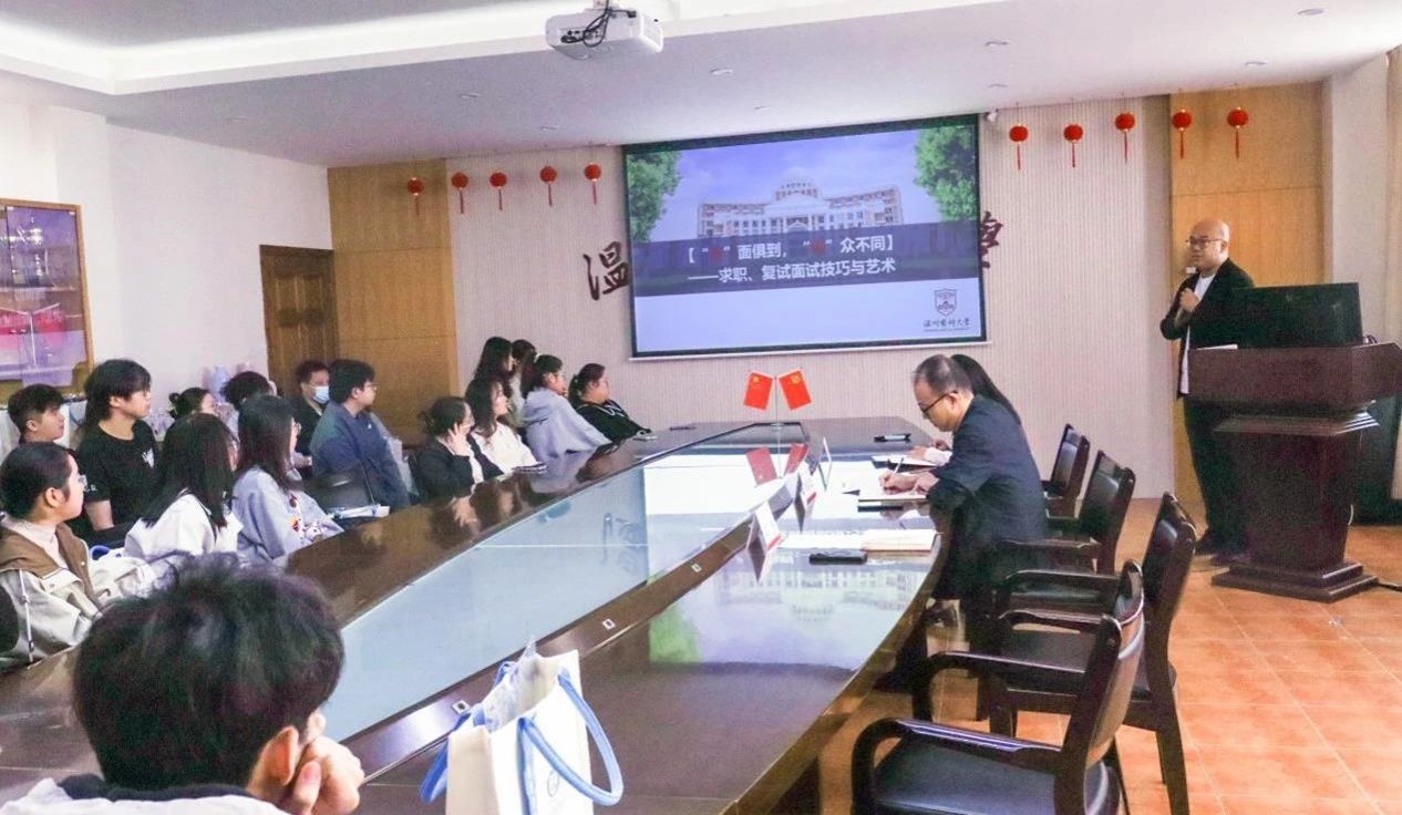 学工办副主任彭翔以“面”面俱到,“语”众不同为主题,开展面试辅导讲座。他围绕面试技巧进行了详细的讲解,强调要树立求职自信心、提前准备好求职材料以及注意面试着装和礼仪等方面,并围绕视频案例和典型面试问题进行剖析,让毕业生们更直观地了解到面试时要注意的细节和技巧,为毕业生求职就业赋能。