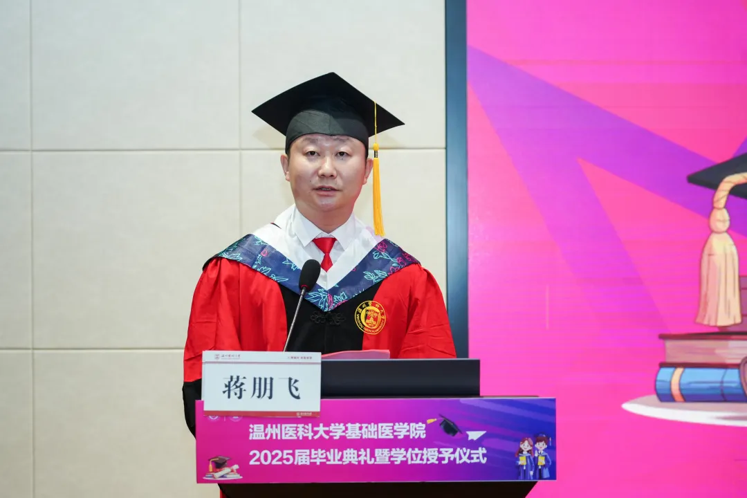 典礼上,郑飞中书记给全体毕业生上了最后一堂党课。在本次党课中,郑飞中书记对毕业生们谆谆教诲,殷殷期望:他强调传承温医精神的重要性,勉励毕业生传扬“仁肃勤朴,求是奋发”的校训,勇攀医学高峰。他希望全体毕业生都能坚守基础气质,始终“如切如磋,如琢如磨”地踏实工作,保持"板凳甘坐十年冷"的定力。他希望全体毕业生都能满怀赤子热情,扎根中国大地,争答青春问卷。同时,他也向全体毕业生送上祝福,鼓励毕业生要在未来生活中始终保有“基础人”的精神特质,踔厉奋发、坚韧不拔。