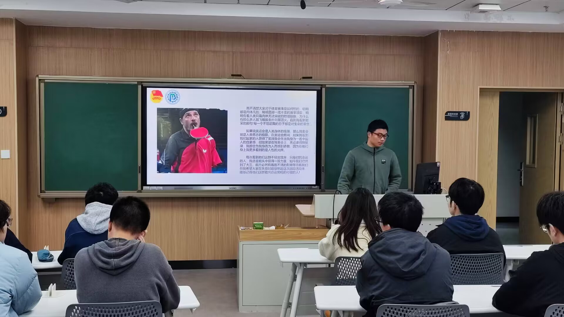 首先,在团支书邹睿熙的带领下全体团员青年齐唱团歌。随后他用一个名为《渺小的人类啊,为什么要和世界为敌》的短视频切入本次团日活动。视频中,残奥会的每一位运动员们都没有因为自己的不幸过往而怨天尤人或是沉浸在痛苦之中无法自拔,而是一直保持着阳光开朗、拼搏奋斗的姿态面对着一切,艰难的训练、比赛时的焦虑受伤都没有能将他们击垮,他们虽然身体上有残缺,但却是精神上的巨人。
