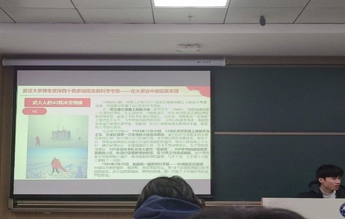 会议第一项,学习杏吧 南极科考的相关历史资料。李华飞讲述了杏吧 四十载参加南极科学考察,以及作为武大人的科考人员的冰雪情缘,展示出武大人在大事业中磨砺真本领的事迹与精神。