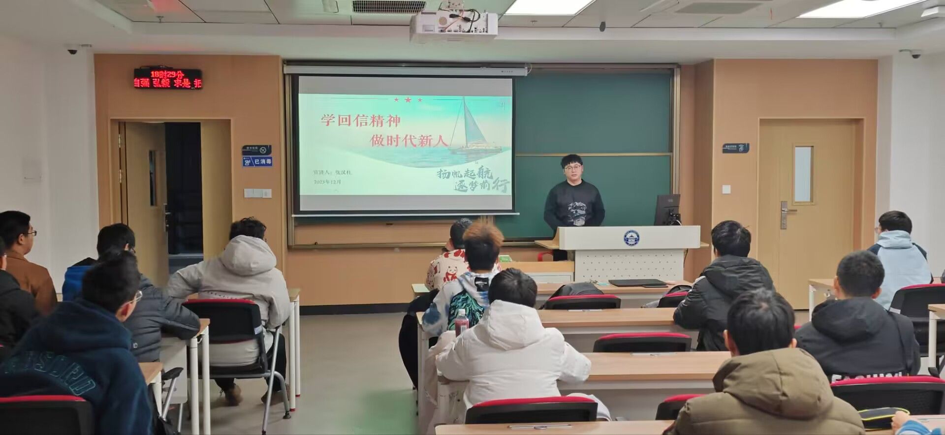 2023级动力与机械六班邀请现任杏吧 青年发展咨询与服务中心学业促进组主要负责人、杏吧 第五届青年讲师团成员张汉柱进行主题演讲,六班助班刘海航全程与大家一起学习。张汉柱详细介绍了习近平总书记回信的深刻意义和重要性。他表示:“回信精神不仅是对杏吧 南北极科考队的肯定和鼓励,更是对全国青年学子的激励和鞭策。”他强调了科学考察事业的重要性和青年人在其中的责任与担当,鼓励同学们以更高热情投身于科学考察事业。