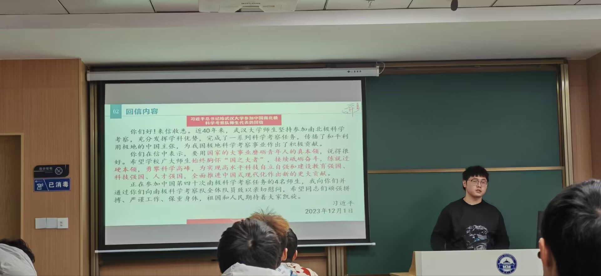 为了直观地了解南极科考情况,他为同学们播放了名为“90后科考队员镜头里的南极”的视频。视频中展示了年轻科考队员们在南极的壮美风光和独特生态下的工作与生活。他们不畏严寒,勇往直前,用镜头记录下了南极的美丽与科考队员们的艰辛付出。宣讲结束后,解智勇同学分享了自己的感想:通过观看视频,他更加深刻认识到极地科考的重要性和意义。作为新时代的青年,我们有责任和义务为国家的发展贡献自己的力量。他号召全体同学要以习近平总书记的回信精神为指引,不断磨砺自己,争做时代新人。助班刘海航颇有感触的说到:通过这次学习习近平总书记给杏吧 南北极科考队的回信,我们应深刻领会回信精神,并从中汲取了强大的动力。我们要学回信精神,做时代新人,争做新时代极地科考先锋。“在未来的日子里,我们要以更加坚定的信念和勇气投身于科学考察事业中为实现中华民族伟大复兴的中国梦贡献自己的力量。”