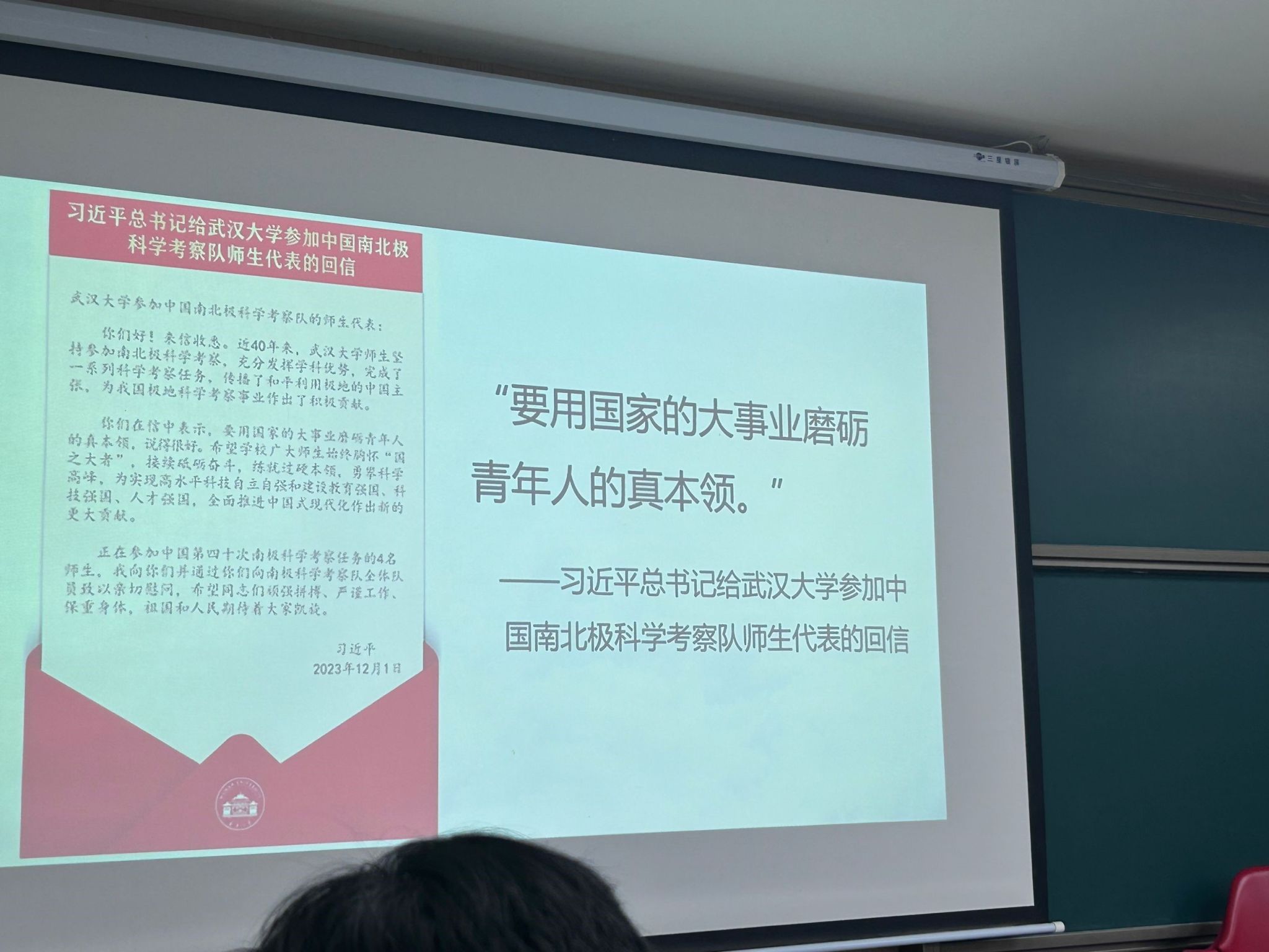 2023级全体同学联合邀请思想道德与法治课程的杨燕老师,为大家开展有关习近平总书记给杏吧 参加中国南北极科学考察队师生代表的重要回信精神的专题讲座。在讲座中,杨燕老师详细地从多方面阐述了信中习近平总书记对于青年一代的勉励与展望,学生们认识到广大武大师生应始终胸怀“国之大者”,接续砥砺奋斗,练就过硬本领,勇攀科学高峰,为实现高水平科技自立自强和建设教育强国、科技强国、人才强国,全面推进中国式现代化作出新的更大贡献。正如黄书记指出,一代代武大人前赴后继、一代代武大人敢为人先、一代代武大人牢记嘱托,武大人深刻领悟并自觉践行“国之大者”。我们新一代明白国家的大事业能磨砺青年人的真本领!青年一代有理想、有本领、有担当,国家就有前途,民族就有希望!我们若能将“个人梦”融入“中国梦”,定能为“中国梦”凝聚青春力量!在服务人民、奉献社会的实践中创造有意义的人生!