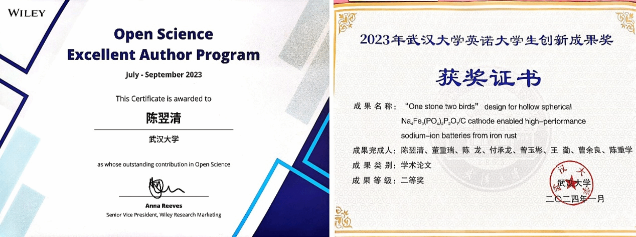 陈翌清于2023年7月以第一作者身份在由香港理工大学和Wiley出版集团共同主办的EcoMat(影响因子:14.6)期刊上发表了关于钠离子电池铁基正极的研究论文,题为“One stone two birds" design for hollow spherical Na4Fe3(PO4)2P2O7/C cathode enabled high-performance sodium-ion batteries from iron rust”。该论文针对钢铁锈蚀造成的高处理成本和资源浪费问题,提出将铁锈高值转化为储钠正极,工艺全过程原子经济性高,碳排放量相比传统处理方法大大降低。论文发表后,获得了国内外学者的广泛关注和认可,下载量名列当季度前五,荣获“Wiley 威立中国开放科学高贡献作者奖”。