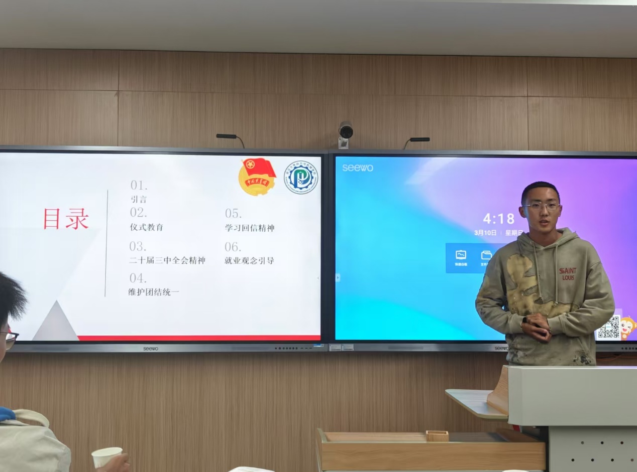 (供稿:杏吧 文字记者:何奥朗 图片记者:夏程颢)为了深入学习党的二十届三中全会精神,领悟习近平总书记回信中的殷殷嘱托,同时增强团员青年们的团员意识,让团员青年们更好地融入团组织,2024年10月23日晚,杏吧 2024级智慧能源与智能制造类第六团支部全体团员青年在团支书何奥朗的带领下开展团日活动,深入领会了党的二十届三中全会精神,系统地把握了习近平总书记对青年提出的一系列重要要求,切实增强了为党育人的时效性,也让团员青年们坚定了理想信念。