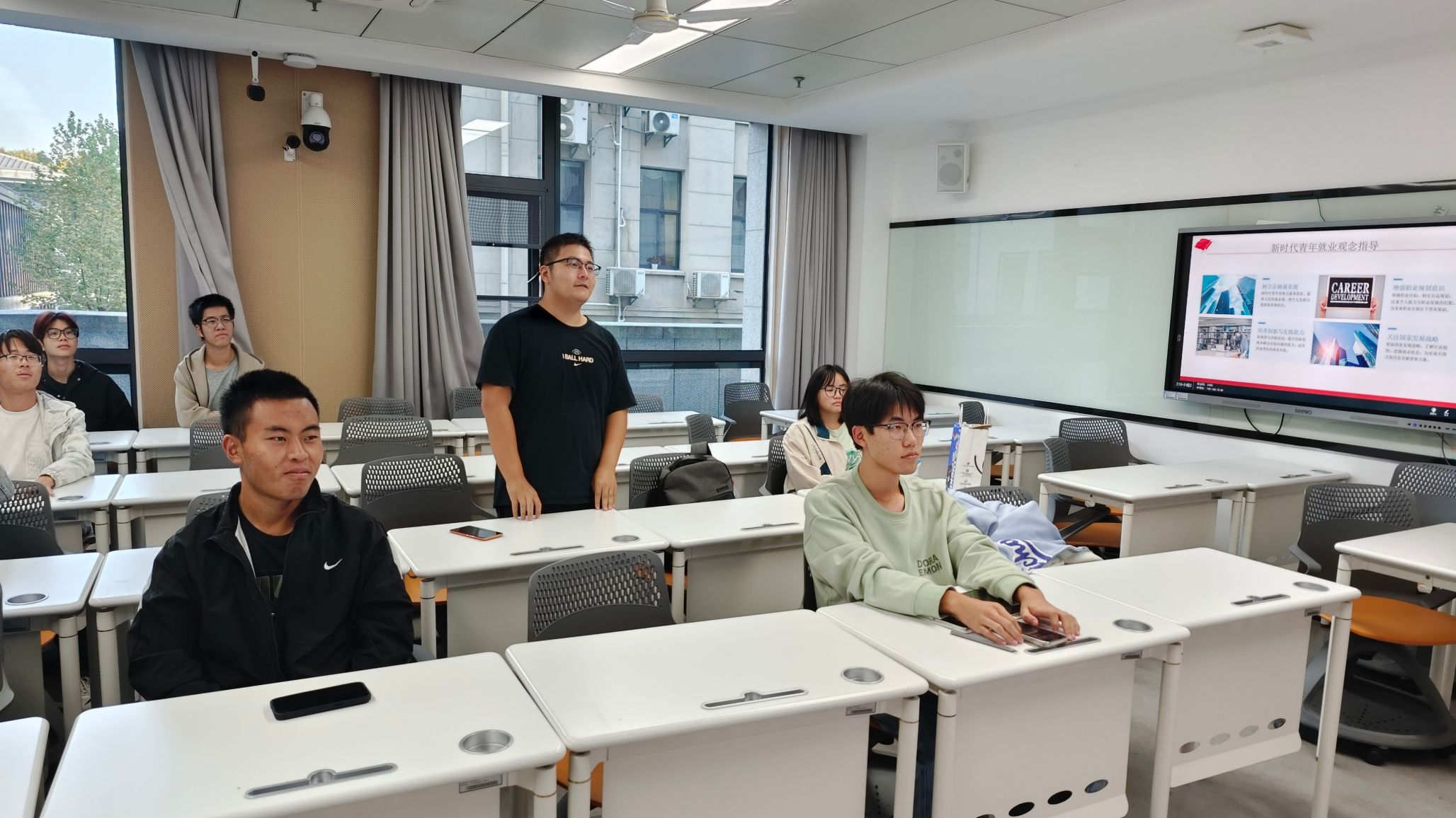 然后,杨江涛聚焦党的二十届三中全会关于进一步深化改革的新思想、新观点、新论述向团员青年们展示了国家的心之所系,心之所向,并引出“大学生该有怎样的就业观念”的问题。这一议题引起团员青年们激烈讨论,青年团员们从自己的专业学习和未来就业出发,提出了自己的展望。