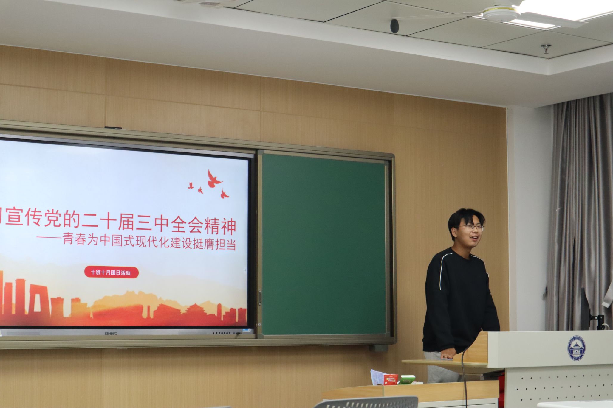 活动在庄严的团歌声中正式拉开帷幕,团支书左子君致辞,他首先阐述了党的二十届三中全会精神的重要意义和国庆节的深远影响。随后,在左子君的带领下,团员青年们一同观看了由第十团支部精心制作的PPT,对党的二十届三中全会精神有了更为深入的了解,并对新时代共筑中国梦的认识达到了一个新的高度,也更加坚定了为伟大中国梦奋斗终身的信念。