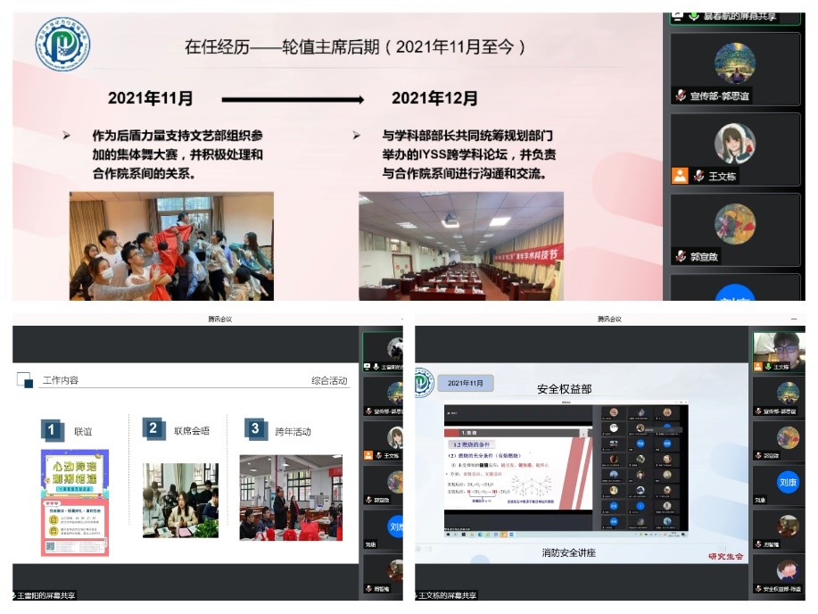 首先,暴春航、王雷阳、王文栋三位主席团成员分别汇报了各自分管部门的工作成果,分享了自己担任执行主席期间的所学所想,总结了工作中的不足之处,详细规划了下一阶段的工作,他们的认真负责得到了老师和同学们的一致认可。