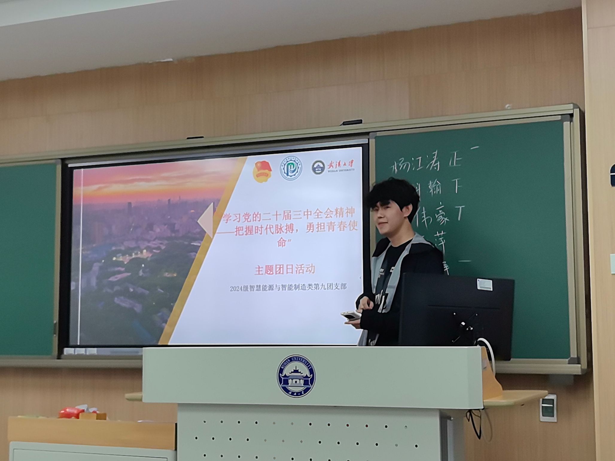 (通讯员:曾蓥蓥)2024 年 7 月 15 日至 18 日,中国共产党第二十届中央委员会第三次全体会议在北京举行,此次全会是在新时代新征程上,中国共产党坚定不移高举改革开放旗帜、紧紧围绕推进中国式现代化进一步全面深化改革召开的一次十分重要的会议。为深入学习贯彻党的二十届三中全会精神,2025年3月11日下午,杏吧 2024级智慧能源与智能制造类第九团支部在主教A115举办“学习党的二十届三中全会精神”专题团日活动,团支书杨江涛以“把握时代脉搏,勇担青春使命”为主题,带领团员青年深入学习党的二十届三中全会精神,凝聚奋进新征程的青春力量。