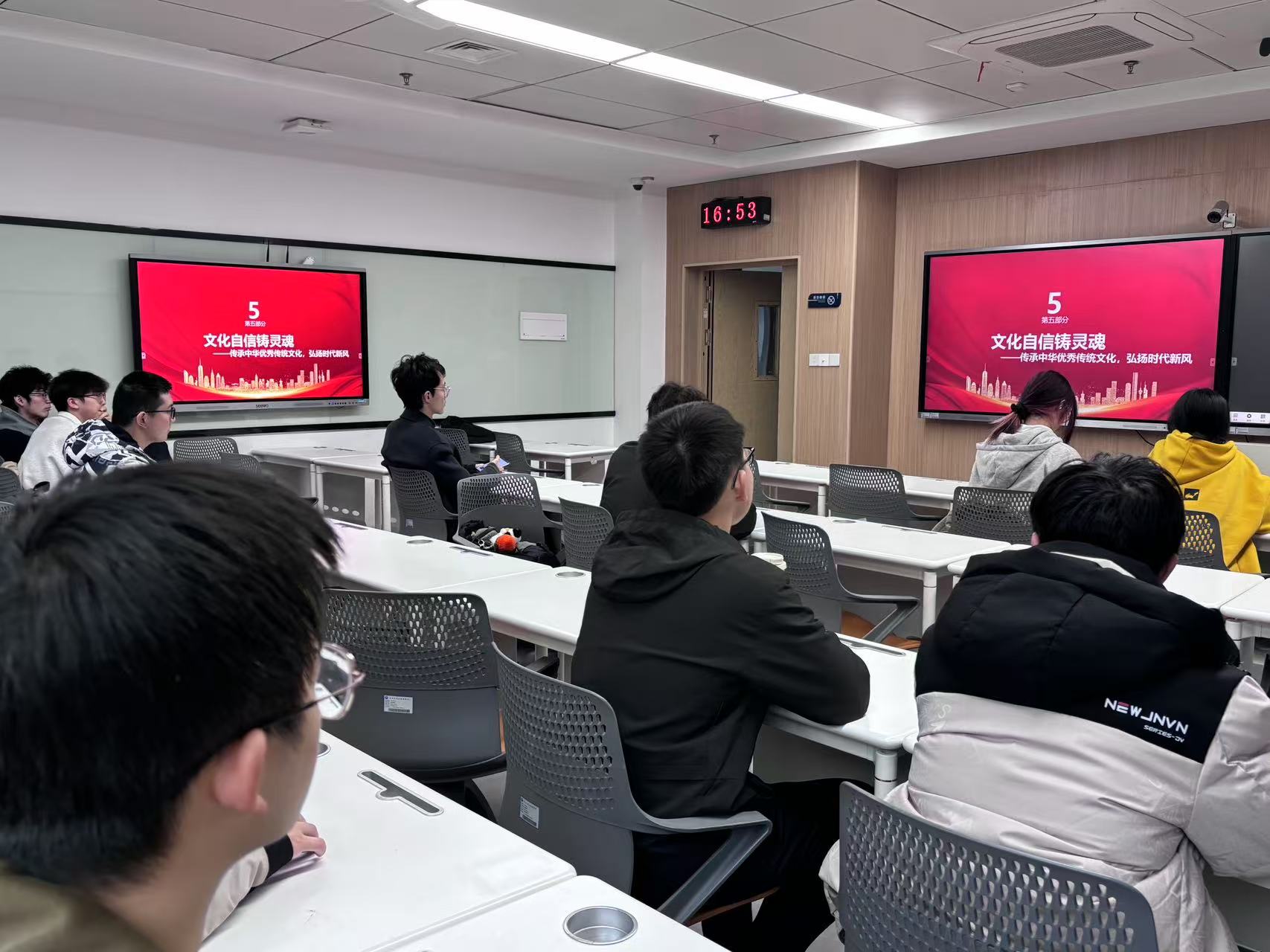 第五个主题为“文化自信铸灵魂”。团员们通过学习中国传统文化、开展文化知识问答等活动,增强了对中华优秀传统文化的认同感和自豪感。熊欣瑶结合精心准备的幻灯片为团员们详细讲解了中国传统文化的深厚底蕴和独特魅力,她深入浅出地阐述了从古至今的文化演变,以及这些文化如何影响着我们的日常生活和价值观。随后的文化知识问答活动中,题目涵盖了诗词、历史、书法等多个方面,团员们积极参与,现场气氛热烈。