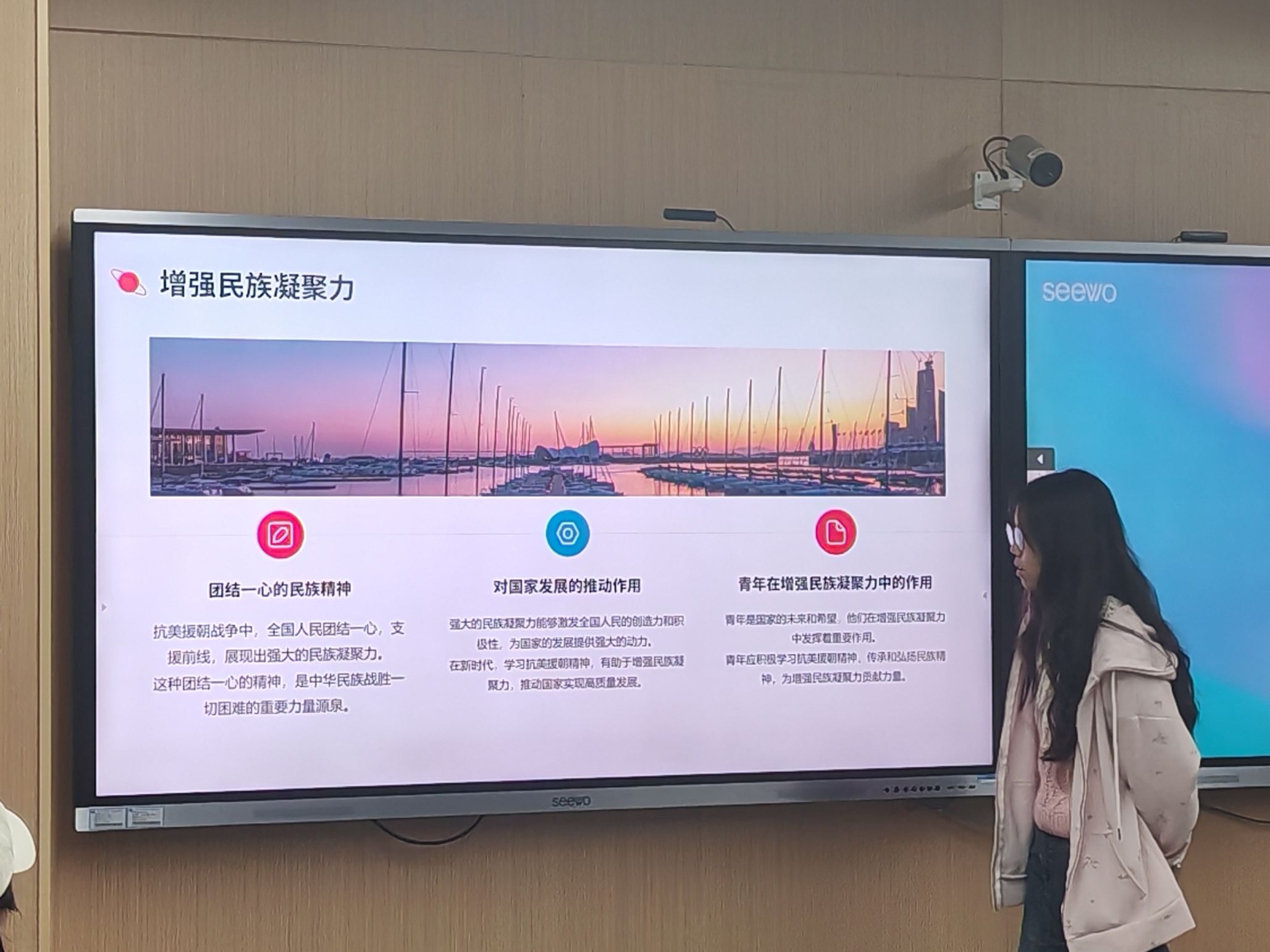 随后,由组织委员黄悦围绕抗美援朝精神展开深入讲解。通过PPT展示,团员青年们了解到了抗美援朝精神的内涵与价值。在极端恶劣的环境下,志愿军战士展现出的革命英雄主义精神令人动容。他们以顽强的毅力与敌人展开殊死搏斗,这种精神不仅体现在战场上的英勇无畏,更体现在对革命事业坚定不移的信念和无私奉献上。这激励着团员青年们在面对困难和挑战时,要勇于担当、敢于拼搏。同时,志愿军战士在艰苦战争环境中始终保持积极乐观的态度,用歌声和信念驱散战争的阴霾,这种革命乐观主义精神,让团员青年们认识到在生活和学习中,要保持积极向上的心态,增强心理韧性,在困境中寻找机遇。