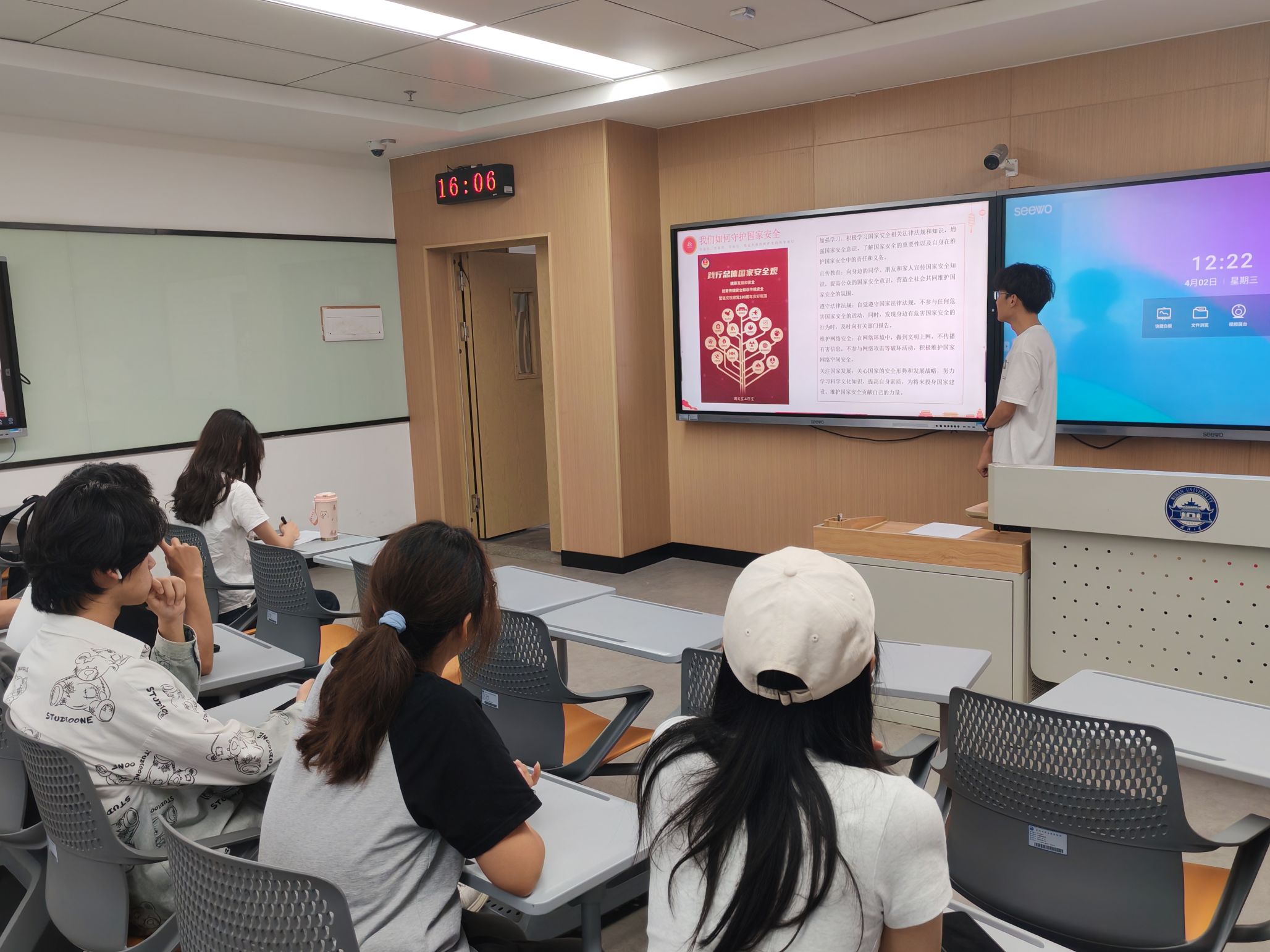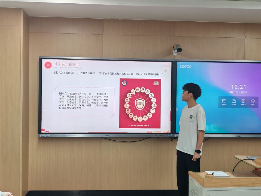 活动的第一部分,团支书栗振杰通过PPT展示和讲解带领大家学习国家安全的内容。习近平总书记在党的二十大报告中指出:“国家安全是民族复兴的根基,社会稳定是国家强盛的前提。”国家安全包含的内容十分广泛,主要包括以下方面:政治安全、国土安全、军事安全、经济安全、文化安全、社会安全、科技安全、网络安全、生态安全、资源安全、核安全、海外利益安全以及太空、深海、极地、生物等不断拓展的新型领域安全等。