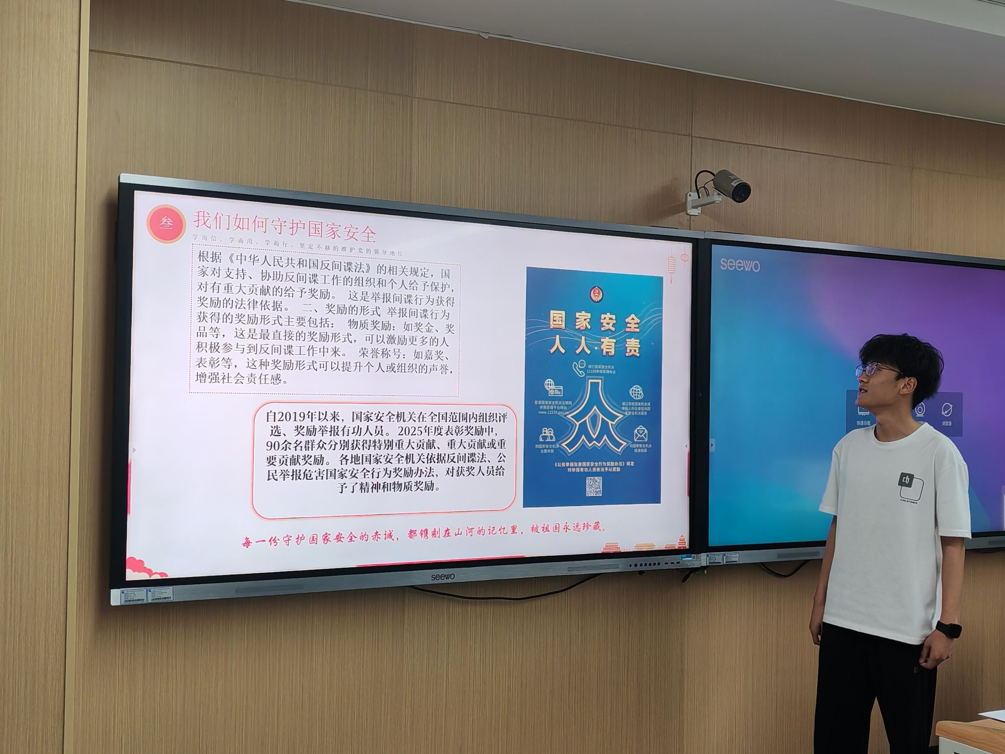 之后,栗振杰通过PPT继续带领大家学习有哪些行为会危害国家安全。他指出基本危害国家安全的行为有五项,包括:1.泄露国家机密:通过各种方式将国家机密信息传递给境外机构、组织或个人,或在国内非法传播,给国家的安全和利益造成损害;2.间谍活动:为境外间谍机构刺探、收集、提供国家秘密或情报,或者参加间谍组织,接受其任务等;3.破坏关键基础设施:如对能源、交通、通信等关乎国计民生的关键基础设施进行破坏、攻击,影响国家正常运转;4.网络攻击:利用网络技术对国家机关、军事机构、重要企业等的信息系统进行攻击、入侵,窃取数据或破坏系统,威胁国家网络安全;5.非法获取国家资源:未经许可,非法开采、获取国家重要资源,或向境外非法出口限制出口的资源,损害国家资源安全。