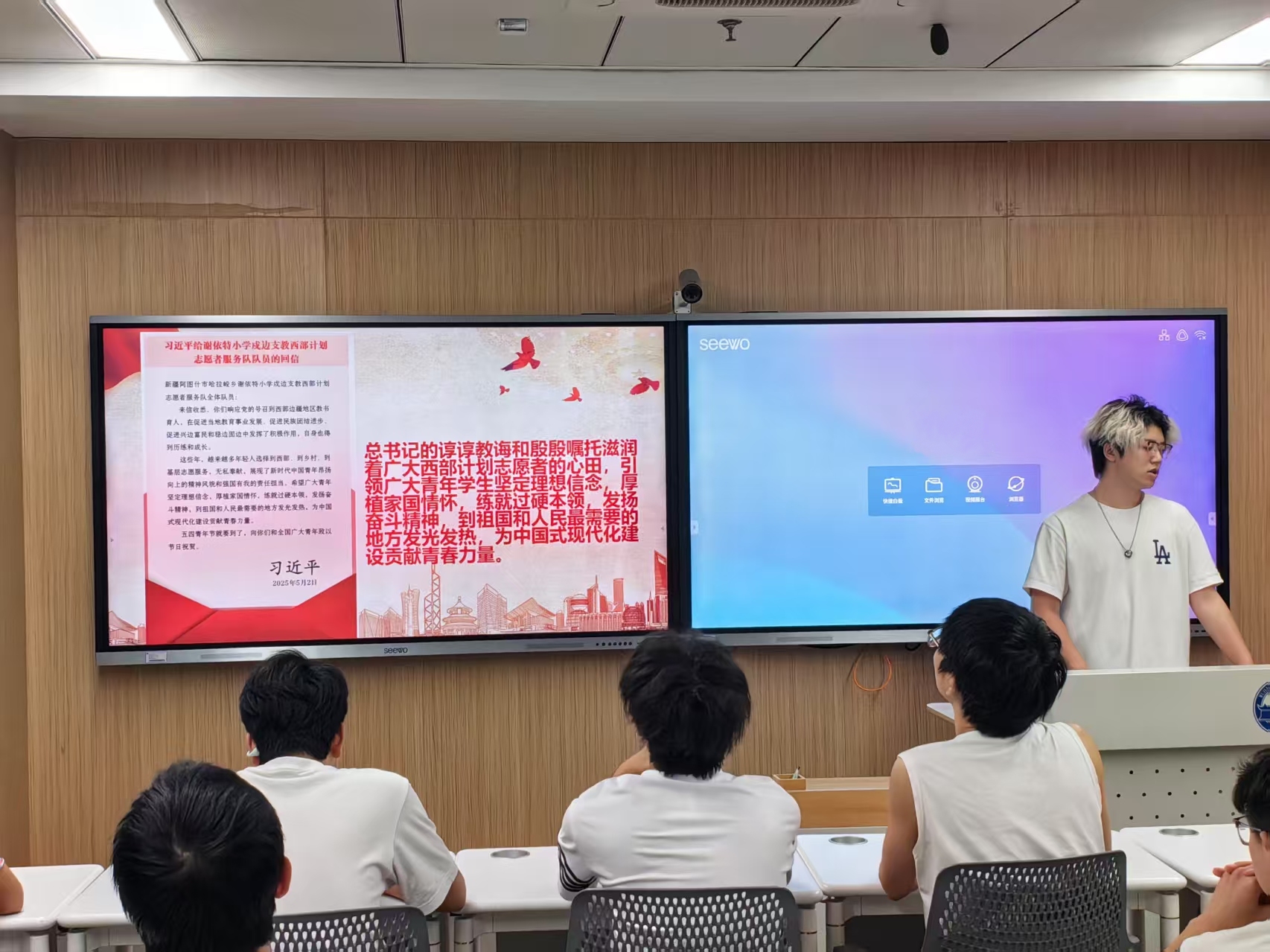 首先进入“学习回信精神,绽放奉献华光——青春为中国式现代化挺膺担当”环节。团支部全体团员青年共同学习了2025年5月2日习近平总书记给新疆克孜勒苏柯尔克孜自治州阿图什市哈拉峻乡谢依特小学戍边支教西部计划志愿者服务队全体队员的回信内容。据悉,22年来,已有54万余名西部计划志愿者接力奉献,在基层一线书写了建功西部、报效祖国的青春篇章。习近平总书记在回信中肯定了志愿者们在促进当地教育发展、民族团结、兴边富民和稳边固边中发挥的积极作用,勉励广大青年坚定理想信念,厚植家国情怀,练就过硬本领,发扬奋斗精神,到祖国和人民最需要的地方发光发热。