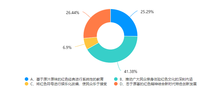 3、调查显示,多数受访者认可红色文化出现了“疲软”状态,关于理由则各有不同,有认为是宣传方式落后,有认为是资本麻痹人民,有认为是精神与时代出现了隔阂,无论如何,这些问题需要我们重视。为扭转“疲软”趋势,我们必须要对问题进行针对性研究,提出解决办法,积极采取措施,才能迸发红色文化的生命力,让红色精神植根于广大中华青年的心中。