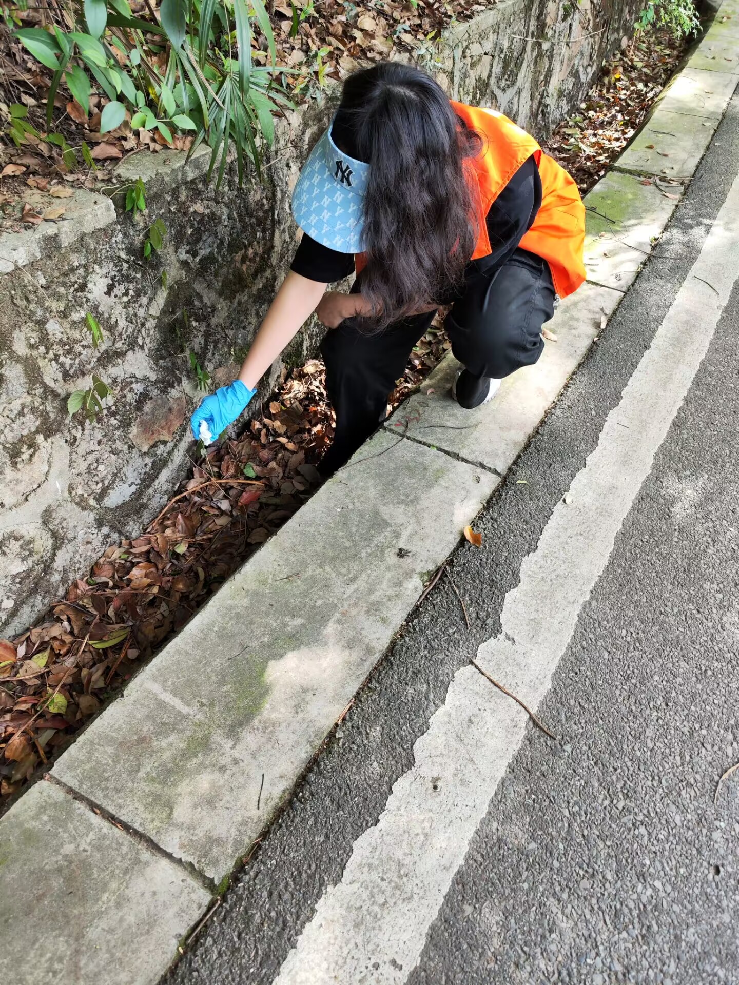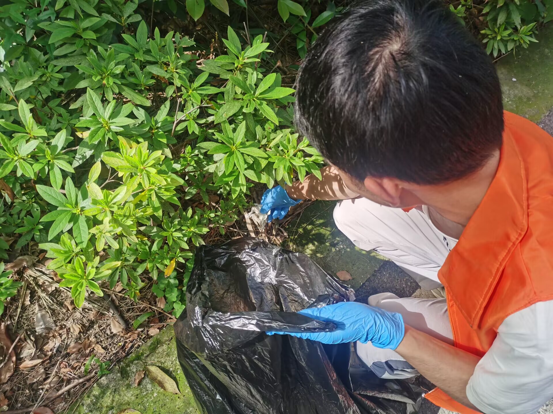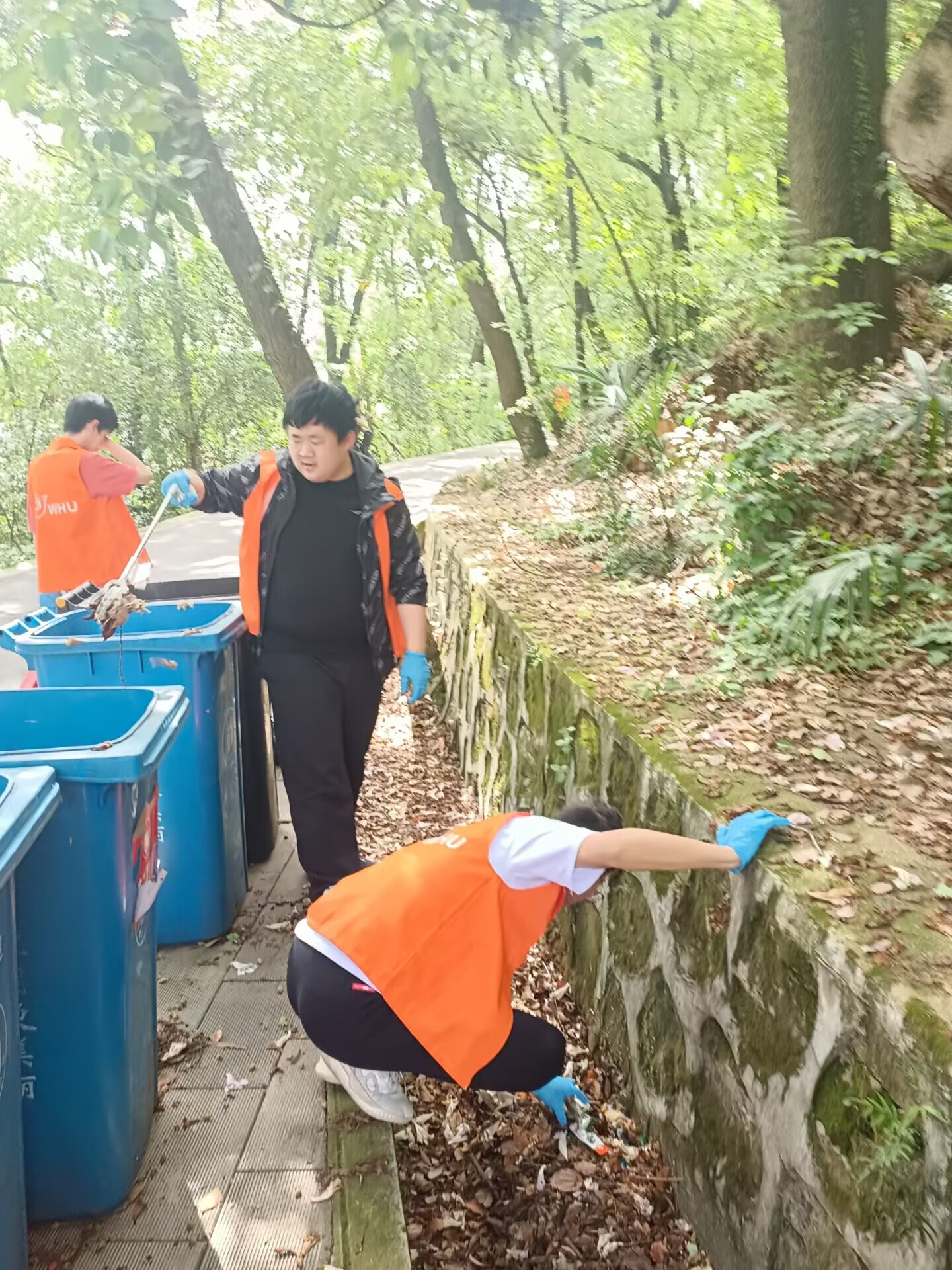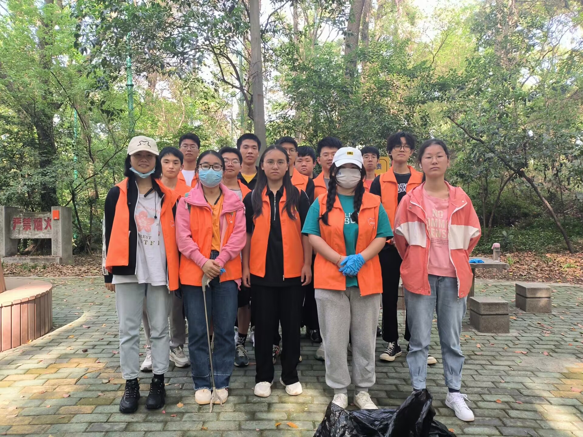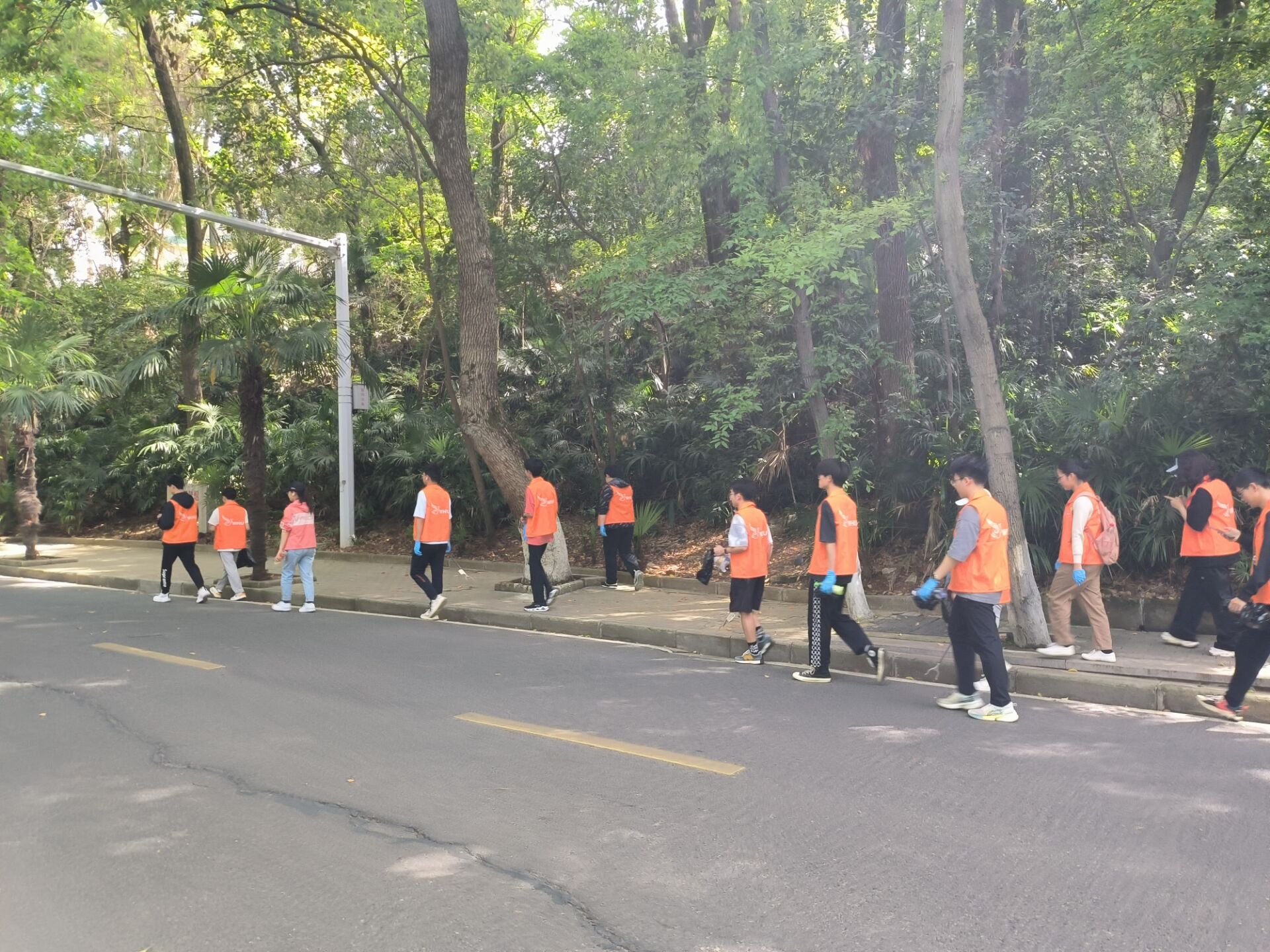 沿着环山北路,灌木郁郁葱葱,志愿者们细细清理零星散落着的矿泉水瓶,塑料袋、纸巾等垃圾。大家各司其职,有人负责用垃圾夹拾取挂在灌木高处的塑料袋;有人负责用垃圾袋收集处理;有人用手套拾取灌木丛中的矿泉水瓶……组内成员协调合作,小组之间互帮互助,一路上其乐融融。山林间一个个忙碌的橘色身影,成了最靓丽的风景线。活动中,大家近距离地与山林灌木接触,充分领略了珞珈山的美丽风光,增强了身为“珞珈学子”的认同感。阳光热烈,山路遥遥,但大家依旧干劲十足,不放过目之所及的任何垃圾,团结互助,用行动诠释了“奉献、友爱、互助、进步”的志愿者精神。
