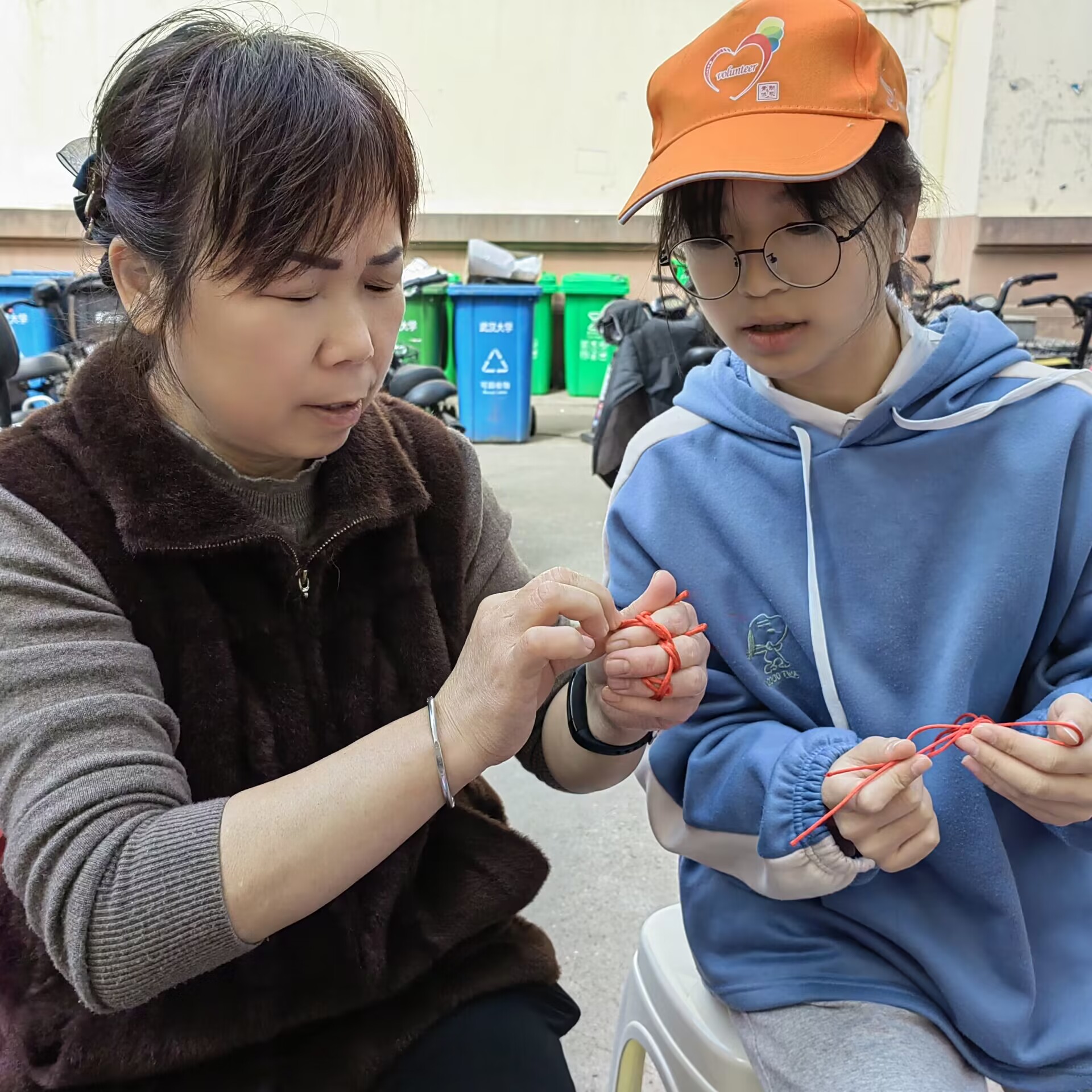 从早晨9:00开始,志愿者们开始耐心地教着每一位参与者编织平安结,平安结虽小,可要想编整齐好看也是一项技术活,从哪里翻转,从哪里拉紧都需要技巧,折纸和剪纸也同样需要投入专注和创意。随着志愿活动的开展,许多路过的阿姨和小孩子们也纷纷加入其中,留下了质朴而又最真实的祝福。
