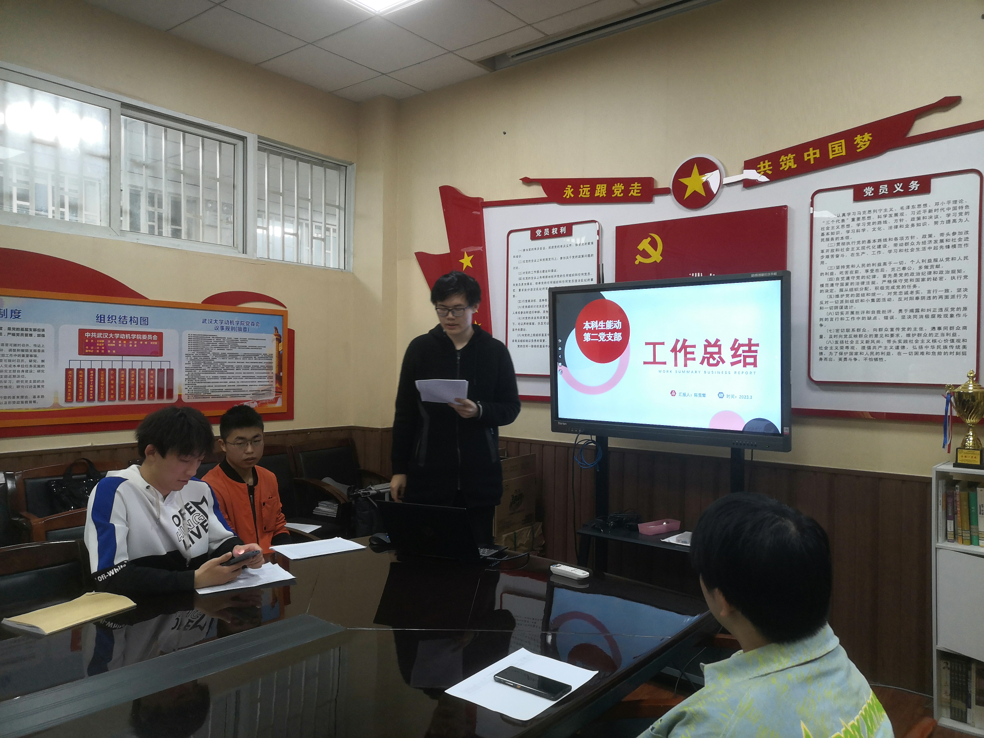 会上,各本科生党支部书记依次做述职报告,围绕“支部情况介绍”、“亮点工作”、“未来计划”几个方面对2022年度的党支部建设工作进行汇报。重点阐述了各支部基础党务工作的具体情况,包括落实“三会一课”制度、组织日常学习、党员发展转正、组织关系调动等。