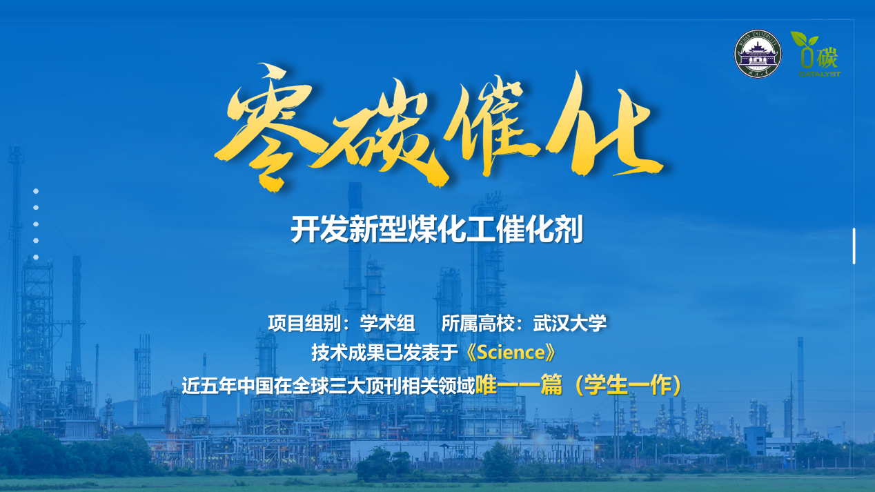 在党的二十大报告中,习近平总书记强调我们要加强煤炭清洁高效利用,加快规划建设新型能源体系。在石化化工行业高质量发展指导意见中,加快突破新型催化是当务之急。《零碳催化——开发新型煤化工催化剂》团队成员在实验室进行了广泛的尝试,直接聚焦煤化工反应过程本身。在煤化工生产过程中,主要是因为水参与副反应,消耗大量原料,产生了大量的二氧化碳。为了避免水参与副反应,团队成员提出一种创新构想,为催化剂穿上一种疏水铠甲,将水阻隔在外,这样就可以避免副反应的发生,做到减排、节水,让更多的碳转化为产物。团队成果已发表于世界三大顶刊之一的“Science”,是团队成员以学生的身份作为第一作者发表,向世界展示了中国学生的创新实力与创新潜力。在参赛过程中,团队成员历经数月,凭借严谨的态度和务实的精神将参赛作品不断打磨完善,以华中赛区学术组金奖的成绩成功晋级,最终在12月28日全国总决赛答辩中取得了金奖的卓越成绩。